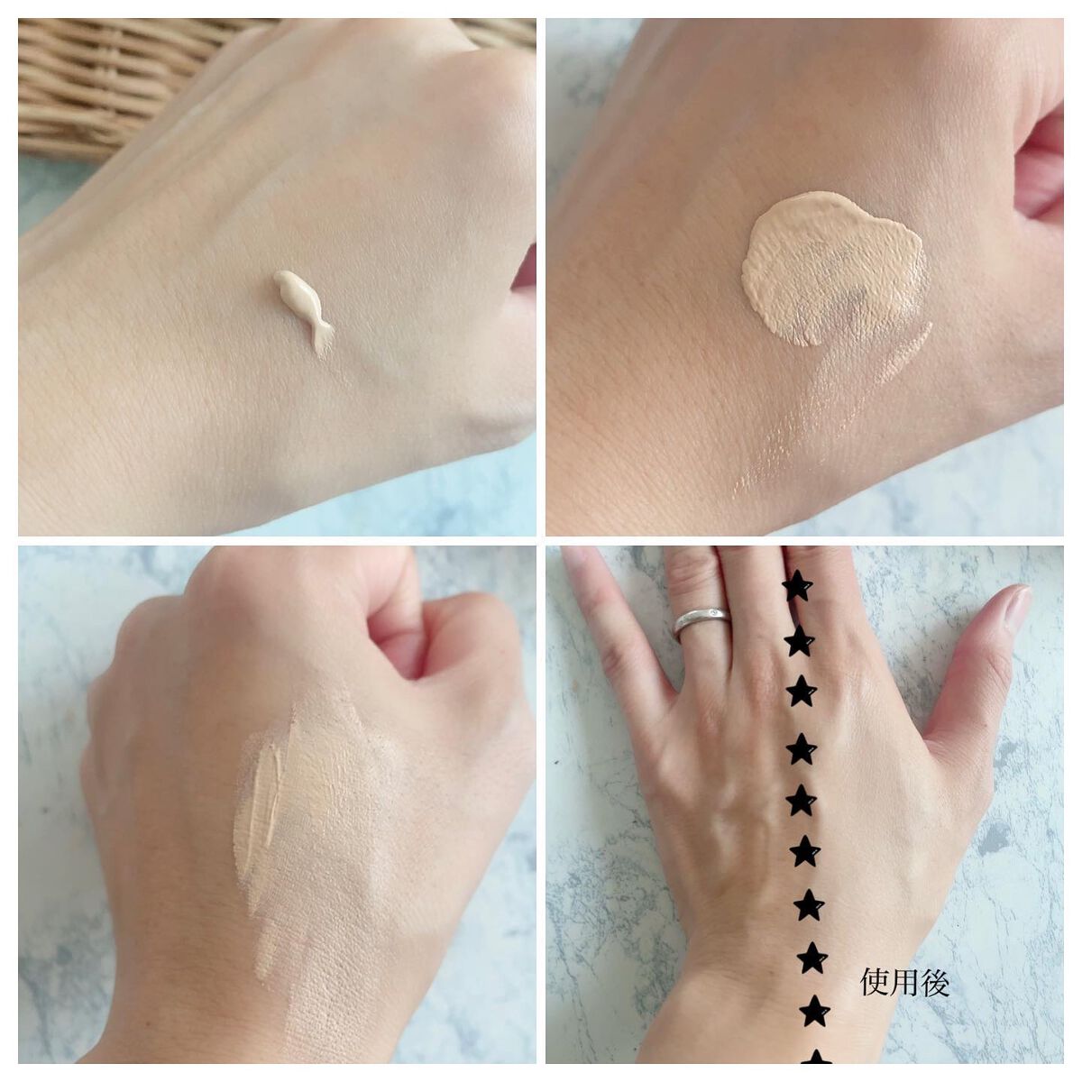 - 成分:水、シクロペンタシロキサン、酸化チタン、メトキシケイヒ酸エチルヘキシル、ミネラルオイル、DPG、イソステアリン酸ソルビタン、ジフェニルシロキシフェニルトリメチコン、グリセリン、トリベヘニン、ジメチコン、(ジメチコン/ビニルジメチコン)クロスポリマー、マルチトール、シリカ、塩化Na、トリメチルシロキシケイ酸、酸化亜鉛、水酸化Al、水添レシチン、含水シリカ、テトライソステアリン酸ジペンタエリスリチル、オリーブ果実油、アーモンド油、ホホバ種子油、メチルパラベン、フェノキシエタノール、(+/-)タルク、酸化鉄