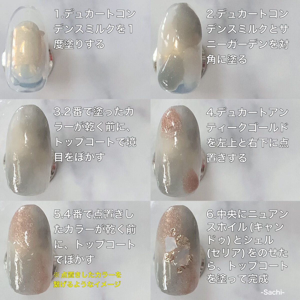ワンカラーでも指ごとに色を変えるだけでオシャレに見えます💕 画像のようにゴールドラインとストーンを少し足すだけで華やかさがアップ🥰 何度かご紹介したことのあるスポンジで作るグラデーションです✨ スポンジを使うことで境目が綺麗に馴染んでくれます💕 アルミホイルの上でブラウンとトップコートを1:1くらいで混ぜたものを、トップコートのハケに取って3箇所に塗るだけ👌 事前に混ぜたものを塗ることで、爪の上でぼかすより簡単に出来ます💕 ベースカラーが乾く前に点置きしてぼかすことで綺麗にぼかせます✨ スピードが大事なので、使うポリッシュのキャップは全て開けておきましょう😊 天然石のラインはガタガタの方がより天然石っぽく見えるので、ラインを描くのが苦手な方でも大丈夫🙆♀️ 難しそうに見えて、やってみると意外と簡単に出来ます♡