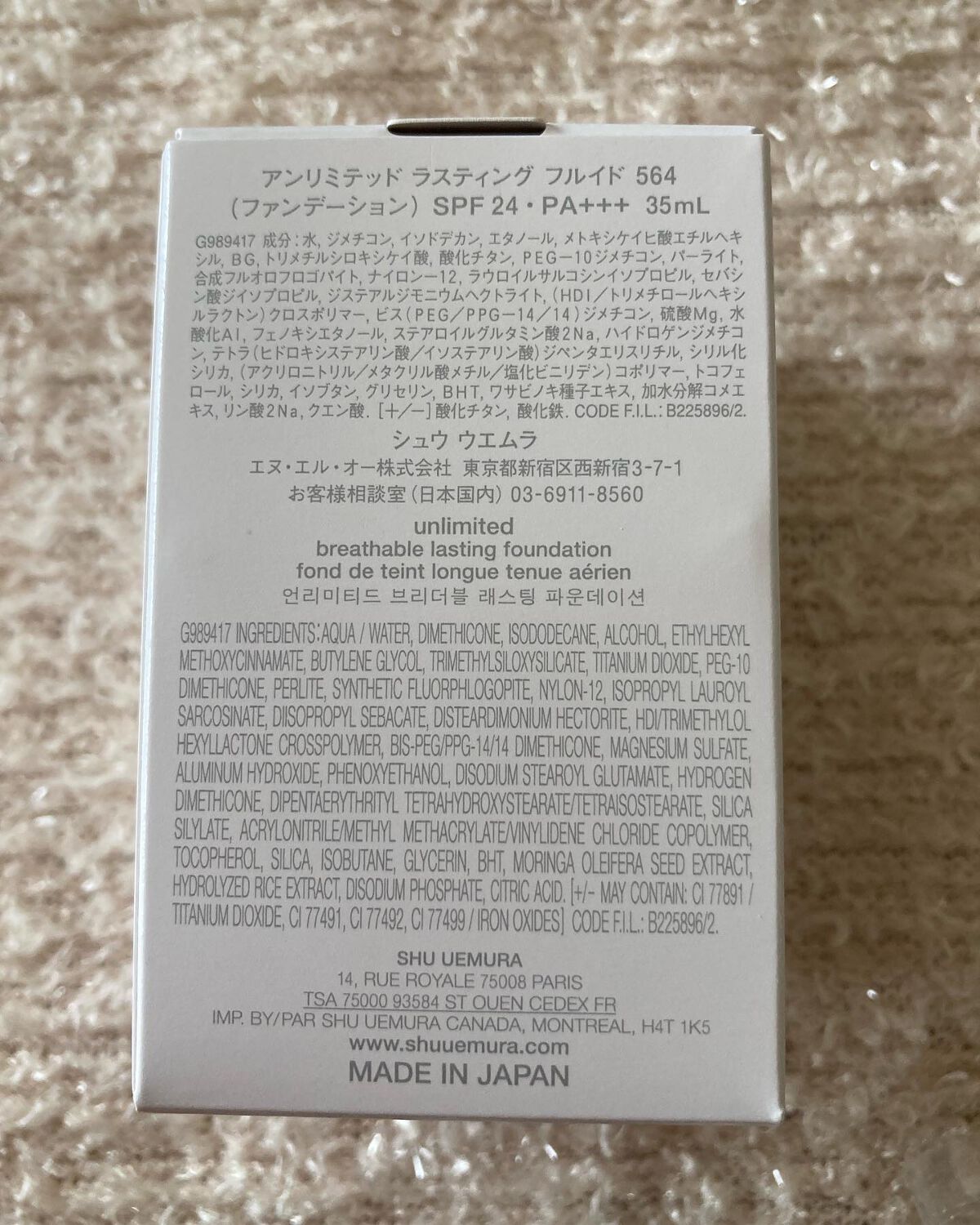 - <375> 水、ジメチコン、イソドデカン、エタノール、メトキシケイヒ酸エチルヘキシル、BG、トリメチルシロキシケイ酸、酸化チタン、PEG-10ジメチコン、パーライト、合成フルオロフロゴバイト、ナイロン-12、ラウロイルサルコシンイソプロピル、セバシン酸ジイソプロピル、ジステアルジモニウムヘクトライト、(HDI/トリメチロールヘキシルラクトン)クロスポリマー、ビス(PEG/PPG-14/14)ジメチコン、硫酸Mg、水酸化AI、フェノキシエタノール、ステアロイルグルタミン酸2Na、ハイドロゲンジメチコン、テトラ(ヒドロキシステアリン酸/イソステアリン酸)ジベンタエリスリチル、シリル化シリカ、(アクリロニトリル/メタクリル酸メチル/塩化ビニリデン) コポリマー、トコフェロール、シリカ、イソブタン、グリセリン、BHT、ワサビノキ種子エキス、加水分解コメエキス、リン酸2Na、クエン酸、〔+/-〕酸化チタン、酸化鉄 <453> 水、ジメチコン、イソドデカン、エタノール、メトキシケイヒ酸エチルヘキシル、BG、トリメチルシロキシケイ酸、酸化チタン、PEG-10ジメチコン、パーライト、合成フルオロフロゴバイト、ナイロン-12、ラウロイルサルコシンイソプロピル、セバシン酸ジイソプロピル、ジステアルジモニウムヘクトライト、(HDI/トリメチロールヘキシルラクトン)クロスポリマー、ビス(PEG/PPG-14/14)ジメチコン、硫酸Mg、水酸化AI、フェノキシエタノール、ステアロイルグルタミン酸2Na、ハイドロゲンジメチコン、テトラ(ヒドロキシステアリン酸/イソステアリン酸)ジベンタエリスリチル、シリル化シリカ、(アクリロニトリル/メタクリル酸メチル/塩化ビニリデン) コポリマー、トコフェロール、シリカ、イソブタン、グリセリン、BHT、ワサビノキ種子エキス、加水分解コメエキス、リン酸2Na、クエン酸、〔+/-〕酸化チタン、酸化鉄 <463> 水、ジメチコン、イソドデカン、エタノール、メトキシケイヒ酸エチルヘキシル、BG、トリメチルシロキシケイ酸、酸化チタン、PEG-10ジメチコン、パーライト、合成フルオロフロゴバイト、ナイロン-12、ラウロイルサルコシンイソプロピル、セバシン酸ジイソプロピル、ジステアルジモニウムヘクトライト、(HDI/トリメチロールヘキシルラクトン)クロスポリマー、ビス(PEG/PPG-14/14)ジメチコン、硫酸Mg、水酸化AI、フェノキシエタノール、ステアロイルグルタミン酸2Na、ハイドロゲンジメチコン、テトラ(ヒドロキシステアリン酸/イソステアリン酸)ジベンタエリスリチル、シリル化シリカ、(アクリロニトリル/メタクリル酸メチル/塩化ビニリデン) コポリマー、トコフェロール、シリカ、イソブタン、グリセリン、BHT、ワサビノキ種子エキス、加水分解コメエキス、リン酸2Na、クエン酸、〔+/-〕酸化チタン、酸化鉄 <474> 水、ジメチコン、イソドデカン、エタノール、メトキシケイヒ酸エチルヘキシル、BG、トリメチルシロキシケイ酸、酸化チタン、PEG-10ジメチコン、パーライト、合成フルオロフロゴバイト、ナイロン-12、ラウロイルサルコシンイソプロピル、セバシン酸ジイソプロピル、ジステアルジモニウムヘクトライト、(HDI/トリメチロールヘキシルラクトン)クロスポリマー、ビス(PEG/PPG-14/14)ジメチコン、硫酸Mg、水酸化AI、フェノキシエタノール、ステアロイルグルタミン酸2Na、ハイドロゲンジメチコン、テトラ(ヒドロキシステアリン酸/イソステアリン酸)ジベンタエリスリチル、シリル化シリカ、(アクリロニトリル/メタクリル酸メチル/塩化ビニリデン) コポリマー、トコフェロール、シリカ、イソブタン、グリセリン、BHT、ワサビノキ種子エキス、加水分解コメエキス、リン酸2Na、クエン酸、〔+/-〕酸化チタン、酸化鉄 <484> 水、ジメチコン、イソドデカン、エタノール、メトキシケイヒ酸エチルヘキシル、BG、トリメチルシロキシケイ酸、酸化チタン、PEG-10ジメチコン、パーライト、合成フルオロフロゴバイト、ナイロン-12、ラウロイルサルコシンイソプロピル、セバシン酸ジイソプロピル、ジステアルジモニウムヘクトライト、(HDI/トリメチロールヘキシルラクトン)クロスポリマー、ビス(PEG/PPG-14/14)ジメチコン、硫酸Mg、水酸化AI、フェノキシエタノール、ステアロイルグルタミン酸2Na、ハイドロゲンジメチコン、テトラ(ヒドロキシステアリン酸/イソステアリン酸)ジベンタエリスリチル、シリル化シリカ、(アクリロニトリル/メタクリル酸メチル/塩化ビニリデン) コポリマー、トコフェロール、シリカ、イソブタン、グリセリン、BHT、ワサビノキ種子エキス、加水分解コメエキス、リン酸2Na、クエン酸、〔+/-〕酸化チタン、酸化鉄 <534> 水、ジメチコン、イソドデカン、エタノール、メトキシケイヒ酸エチルヘキシル、BG、トリメチルシロキシケイ酸、酸化チタン、PEG-10ジメチコン、パーライト、合成フルオロフロゴバイト、ナイロン-12、ラウロイルサルコシンイソプロピル、セバシン酸ジイソプロピル、ジステアルジモニウムヘクトライト、(HDI/トリメチロールヘキシルラクトン)クロスポリマー、ビス(PEG/PPG
