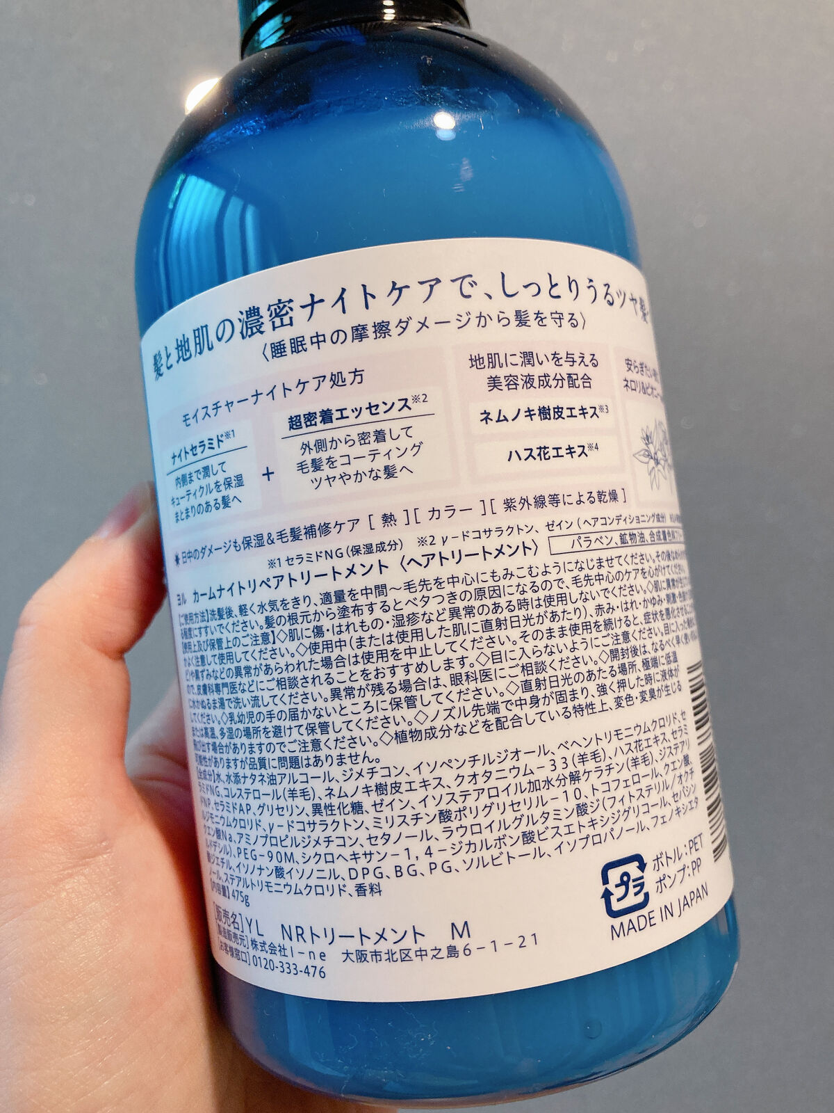- ダメージリスクは日中だけでなく、夜にも。髪と地肌の濃密ナイトケアで、しっとりうるツヤ髪へ。 ナイトキャップ処方で睡眠中の摩擦・乾燥ダメージから髪を守り、地肌に潤いを与える美容液成分配合。 シャンプー:シリコン、パラベン、鉱物油、合成着色料フリー トリートメント:パラベン、鉱物油、合成着色料フリー ◎ネロリ&ピオニーの香り