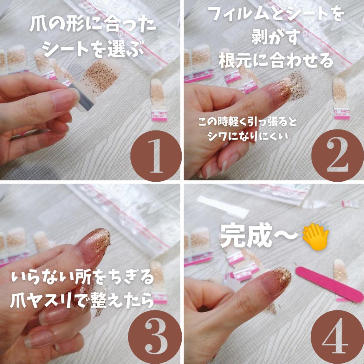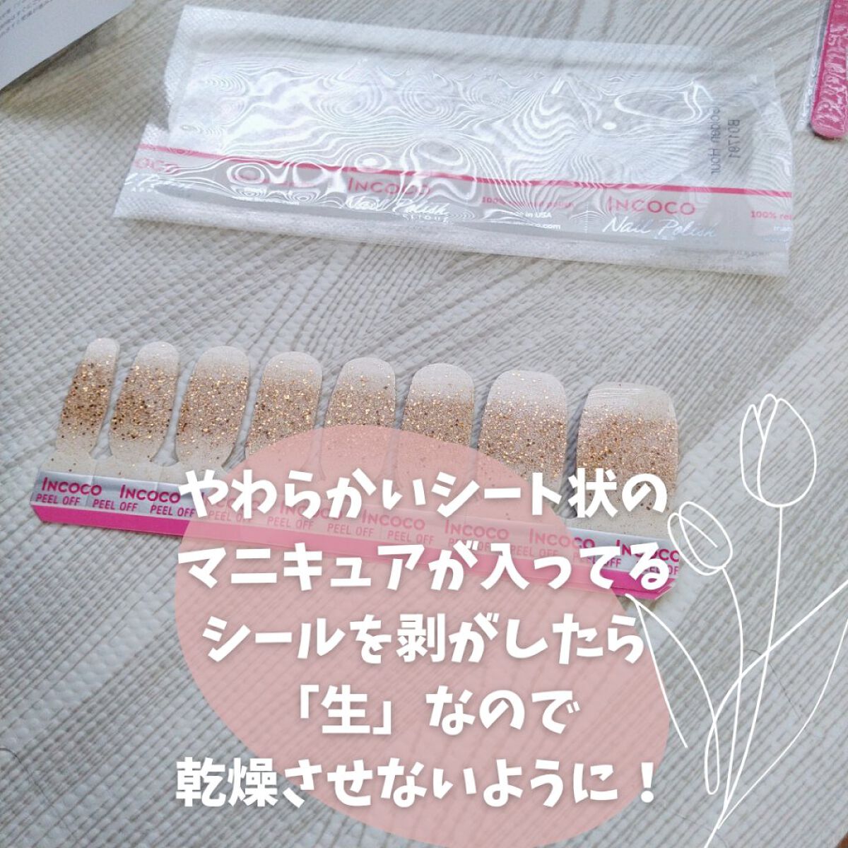 INCOCOマニキュアシート"貼るだけでサロン級ネイルが完成"ということで有名なINCOCO♥️液体タイプのマニキュアから出来ているので薄めのシート💫貼るタイプのマニキュアシートの中でもかなり薄めだと思います🙆🏻♀️よく伸び、爪のカーブにも...
