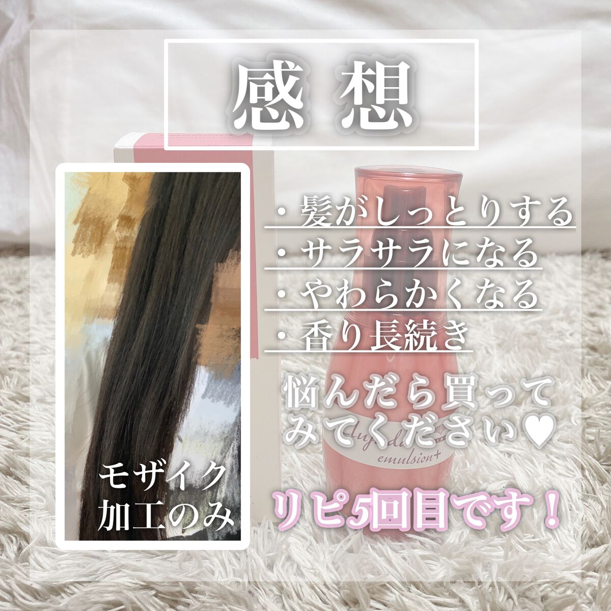 | ヘアケア・スタイリングランキング第54位 | 髪の毛がまとまりやすく、扱いやすくなった感じがして嬉しい🥰 べたつかないさらっと軽やかな使い心地で、手もべたつないから終始快適 | 詳細を見る | |