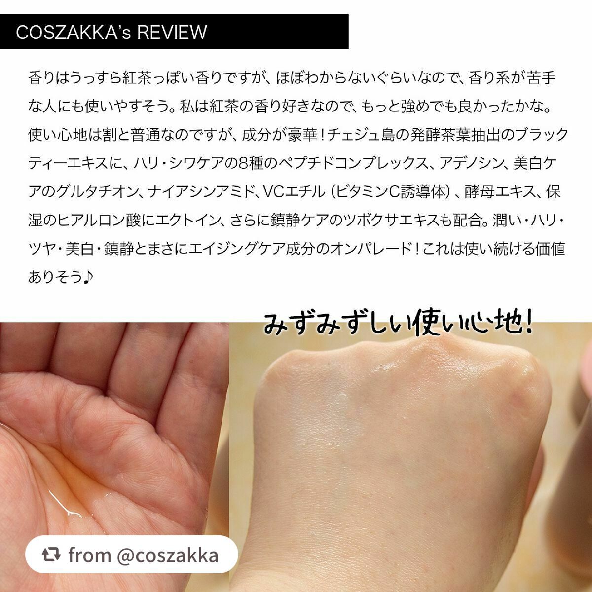 - ※「ブラックティー ユース トリートメント エッセンス」のリニューアル品です。 発酵茶葉*1 の恵みでストレス*2などに左右されない、すこやか肌へ導く導入美容液 1.チェジュ島の発酵茶葉でイキイキすこやか肌へ 美肌のために生まれた、チェジュ島の発酵茶葉を使用。こだわりのマイクロ波抽出方式で得られたブラックティーエキス*¹が角質層のすみずみまで届き、乾燥に負けないイキイキ肌へ導きます。 2.化粧水感覚のマルチ美容液で肌悩みにアプローチ 肌に素早く馴染む、さらりとしたウォーターリーテクスチャーのトリートメントエッセンス。肌状態に合わせて化粧水、導入美容液、美容液の役割までマルチにお使いいただけます。 3.肌の潤い土台を整えるために「ブラックティーペプチドアクティベーター™*³」を採用。 肌の乾燥を防ぎ、イキイキとした肌へ導く「ペプチド」を取り入れた「ブラックティーペプチドアクティベーター™*³」を採用。肌の潤い土台を整え、美肌作りをサポートします。さらに、グルタチオン配合でキメの整ったハリツヤ肌へ導きます。 4.アレルギーテスト済み*⁴、こだわりの無添加処方*⁵ *¹ チャ葉エキス(保湿成分) *² 乾燥や紫外線などの外部刺激 *³ ダイズポリペプチド、(アルギニン/リシン)ポリペプチド、トリペプチド-1銅、アセチルテトラペプチド-11、 アセチルヘプタペプチド-4、ヘキサペプチド-9、アセチルオクタペプチド-3、アセチルヘキサペプチド-8、チャ葉エキス(全て保湿成分) *⁴ 全ての方にアレルギーが起こらないということではありません。 *⁵ 動物性原料、鉱物性油、イミダゾリジニルウレア、トリエタノールアミン、合成色素、人工香料、ポリアクリルアミド、PEG系界面活性剤無配合