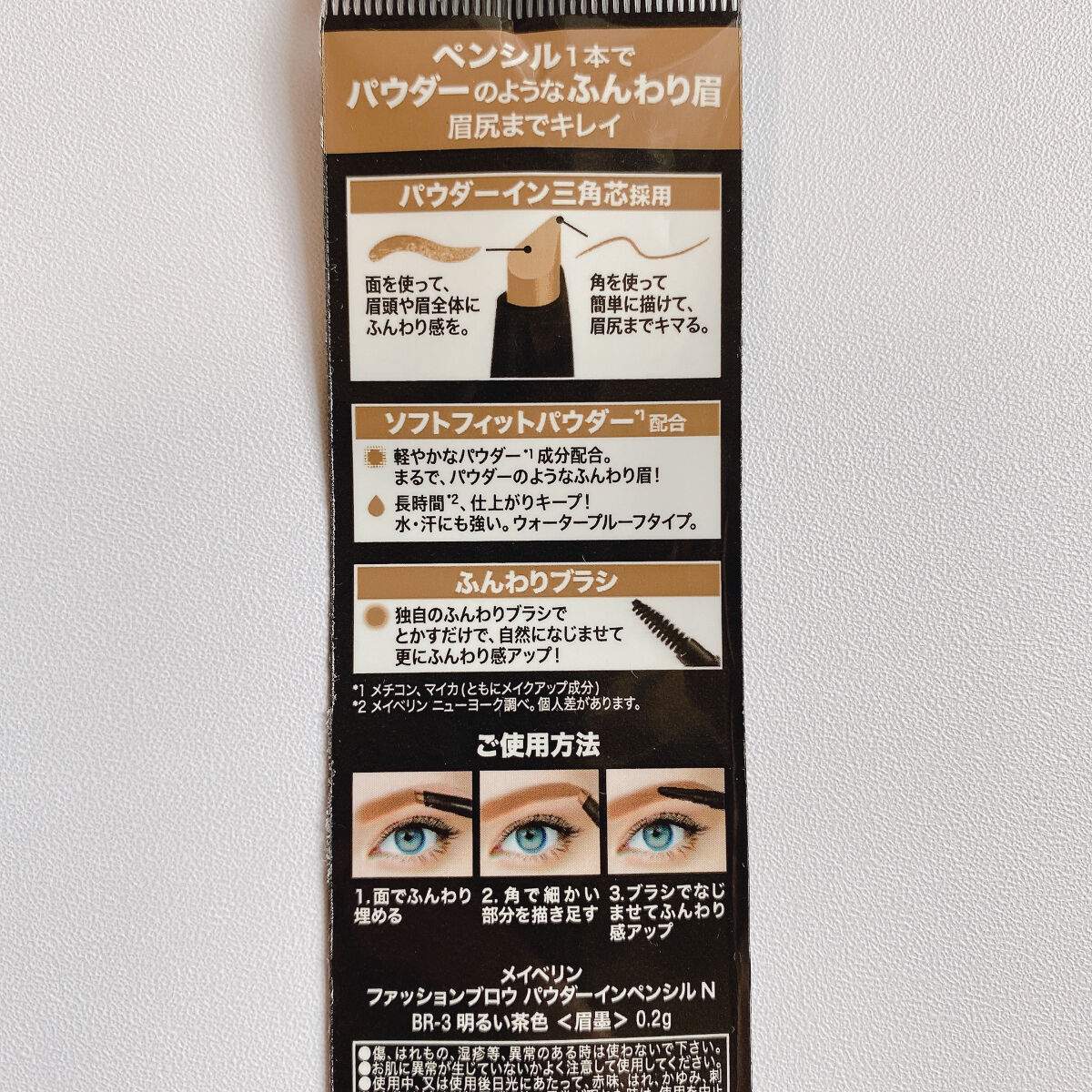 - <2020年3月14日「ファッションブロウ パウダーインペンシル」から「ファッションブロウ パウダーインペンシル N」に名称変更> パウダーのようなふんわり自然な仕上がりなのに、眉毛にしっかり密着、落ちにくい。長時間*²、自然な仕上がりをキープしてくれます。汗・水にも強いウォータープルーフタイプ。 ■1本で様々なラインが自由自在に描ける三角カット芯 角:眉尻もラクラク描き足せる。 表面:眉頭や眉全体に自然な立体感を。 ■・密着パウダー成分配合 描くだけでパウダーのようなふんわりぼかした印象に。しかも眉毛に密着するから長時間*² 仕上がりキープ。 *2 メイベリン ニューヨーク調べ(個人差があります)。