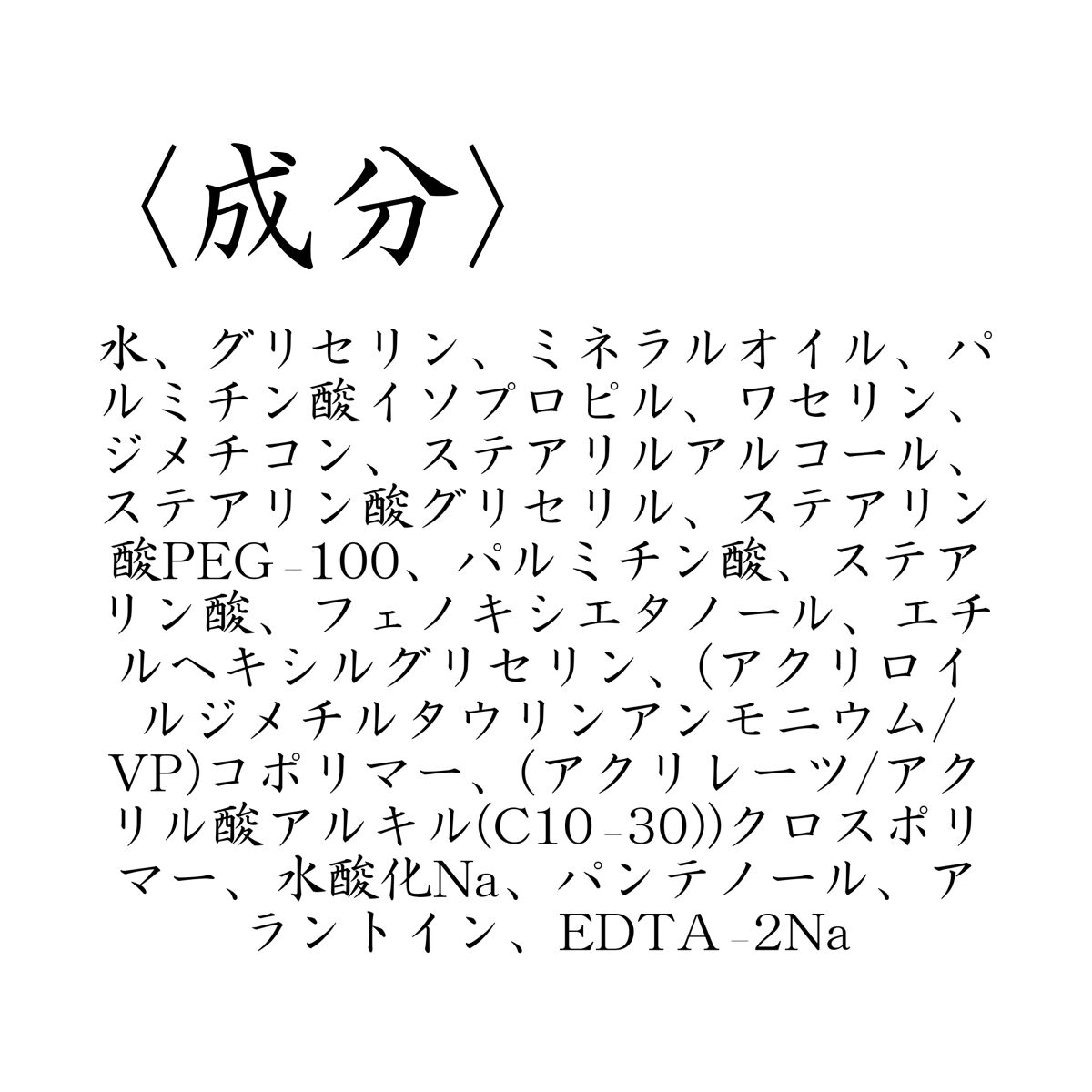 - <450ml> 水、グリセリン、ミネラルオイル、パルミチン酸イソプロピル、ワセリン、ジメチコン、ステアリルアルコール、ステアリン酸グリセリル、ステアリン酸PEG−100、パルミチン、ステアリン酸、フェノキシエタノール、エチルヘキシルグリセリン、(アクリロイルジメチルタウリンアンモニウム/VP)コポリマー、(アクリレーツ/アクリル酸アルキル(C10−30))、クロスポリマー、水酸化Na、パンテノール、アラントイン、EDTA−2Na <250ml> 水、グリセリン、ミネラルオイル、パルミチン酸イソプロピル、ワセリン、ジメチコン、ステアリルアルコール、ステアリン酸グリセリル、ステアリン酸PEG−100、パルミチン、ステアリン酸、フェノキシエタノール、エチルヘキシルグリセリン、(アクリロイルジメチルタウリンアンモニウム/VP)コポリマー、(アクリレーツ/アクリル酸アルキル(C10−30))、クロスポリマー、水酸化Na、パンテノール、アラントイン、EDTA−2Na <950ml> 水、グリセリン、ミネラルオイル、パルミチン酸イソプロピル、ワセリン、ジメチコン、ステアリルアルコール、ステアリン酸グリセリル、ステアリン酸PEG−100、パルミチン、ステアリン酸、フェノキシエタノール、エチルヘキシルグリセリン、(アクリロイルジメチルタウリンアンモニウム/VP)コポリマー、(アクリレーツ/アクリル酸アルキル(C10−30))、クロスポリマー、水酸化Na、パンテノール、アラントイン、EDTA−2Na <限定セット 450ml+250ml> 水、グリセリン、ミネラルオイル、パルミチン酸イソプロピル、ワセリン、ジメチコン、ステアリルアルコール、ステアリン酸グリセリル、ステアリン酸PEG−100、パルミチン、ステアリン酸、フェノキシエタノール、エチルヘキシルグリセリン、(アクリロイルジメチルタウリンアンモニウム/VP)コポリマー、(アクリレーツ/アクリル酸アルキル(C10−30))、クロスポリマー、水酸化Na、パンテノール、アラントイン、EDTA−2Na