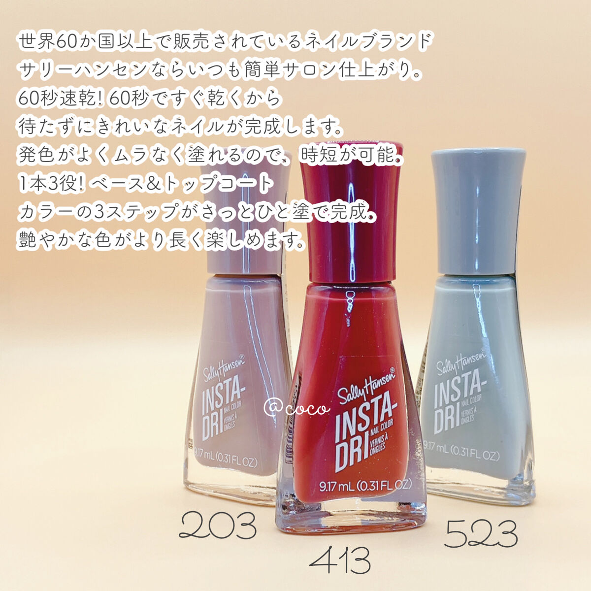 全米No.1売上ネイルブランド サリーハンセンのインスタドライ ネイルカラーはベース・カラー・トップコートの1本3役💅 60秒で速乾なのも嬉しい♡ 私はくすみカラーのバレエコア推し♡