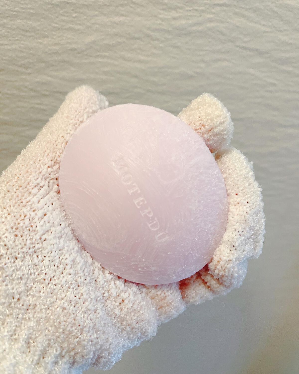 『MOTEPDU(モテプデュ)おしり磨き石けん』.お尻の悩みを洗ってケアできる石鹸🌟.イソプロピルメチルフェノール、グリチルリチン酸2Kといった有効成分を配合✨.石鹸と角質つるつるミトンがセットになっています🙌.このミトンでなでながら洗うこと...