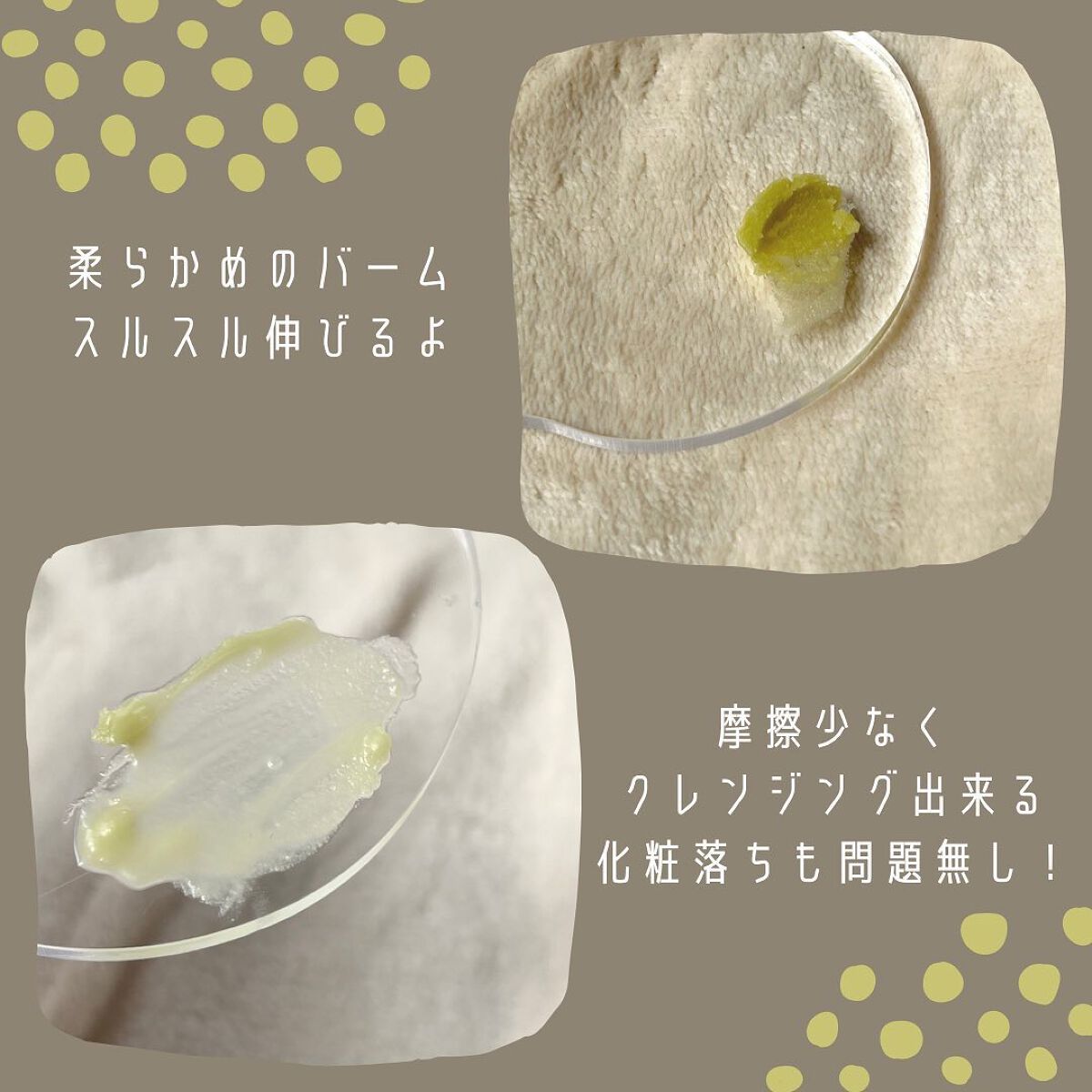 緑茶パウダーとオイルバームテキスチャーで肌に刺激は最小化しながら強力なクレンジング効果を与えてくれます。 肌に乗せると体温ですぐに柔らかくなり、とろとろと溶けてくれます🎶 肌とメイクにピターッと密着してくれて滑りもとても良いなと感じます。 洗い流すとウォータープルーフのメイクもスッキリと落ちてくれました😍 メイク残りもなく、クレンジングのヌルつきや膜感が残ることもありませんでした✨