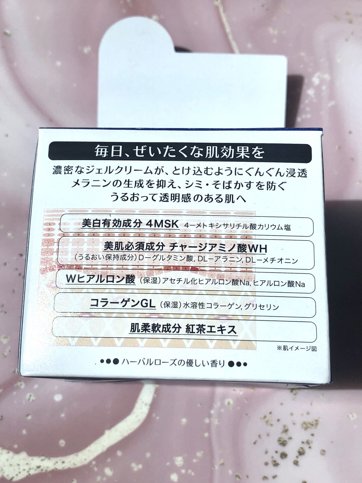 - 'まるでエステな美白ケア' うるおって、透明感 シミ対策!薬用濃密ジェルクリーム ○1品5機能(化粧水、乳液、クリーム、美容液、マスク)の効果をもつ高機能オールインワンジェルクリームです。 ○美白有効成分4MSK※2 配合 ※2 4-メトキシサリチル酸カリウム塩 メラニンの生成を抑え、シミ・そばかすを防ぎます。 ○'まるでエステな美白ケア'を叶えるトリプルエフェクト処方を搭載。使うたびに心地よく、まるでエステ気分を味わえます。 ○濃密なジェルクリームが、肌にとけ込むようにぐんぐんなじみます。 ○うるおって、透明感のある肌に導きます。 ○ハリと透明感のための美肌必須成分チャージアミノ酸WH※3 配合 ※3 (うるおい保持成分) D-グルタミン酸、DL-アラニン、DL-メチオニン ○Wヒアルロン酸配合 (保湿)アセチル化ヒアルロン酸Na、ヒアルロン酸Na ○コラーゲンGL配合 (保湿)水溶性コラーゲン、グリセリン 〇肌柔軟成分 紅茶エキス配合 〇ハーバルローズの優しい香りです。 ○アレルギーテスト済み (全てのかたにアレルギーが起きないというわけではありません。) 医薬部外品