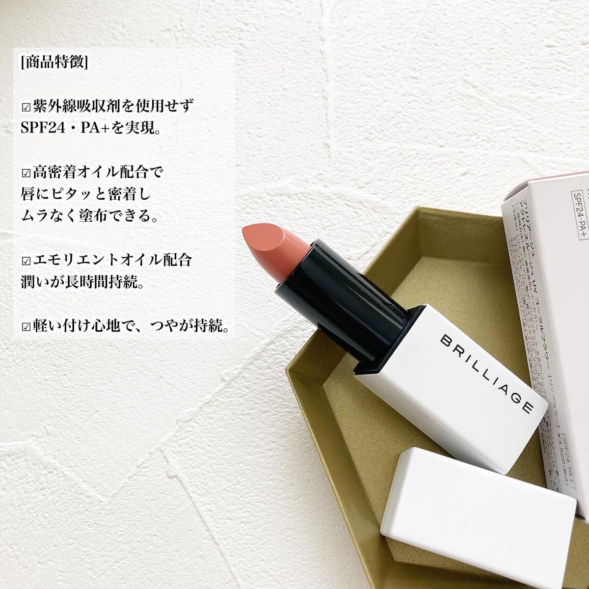 - マスクをはずした瞬間もキレイが叶う!ひと塗りで肌色がワントーンあがる血色カラー ブリリアージュの新色リップは、ポーチに1本しのばせておきたい万能カラー。 ノンケミカル処方に加えて、日常の紫外線もカット。肌映えとケアの両方を実現