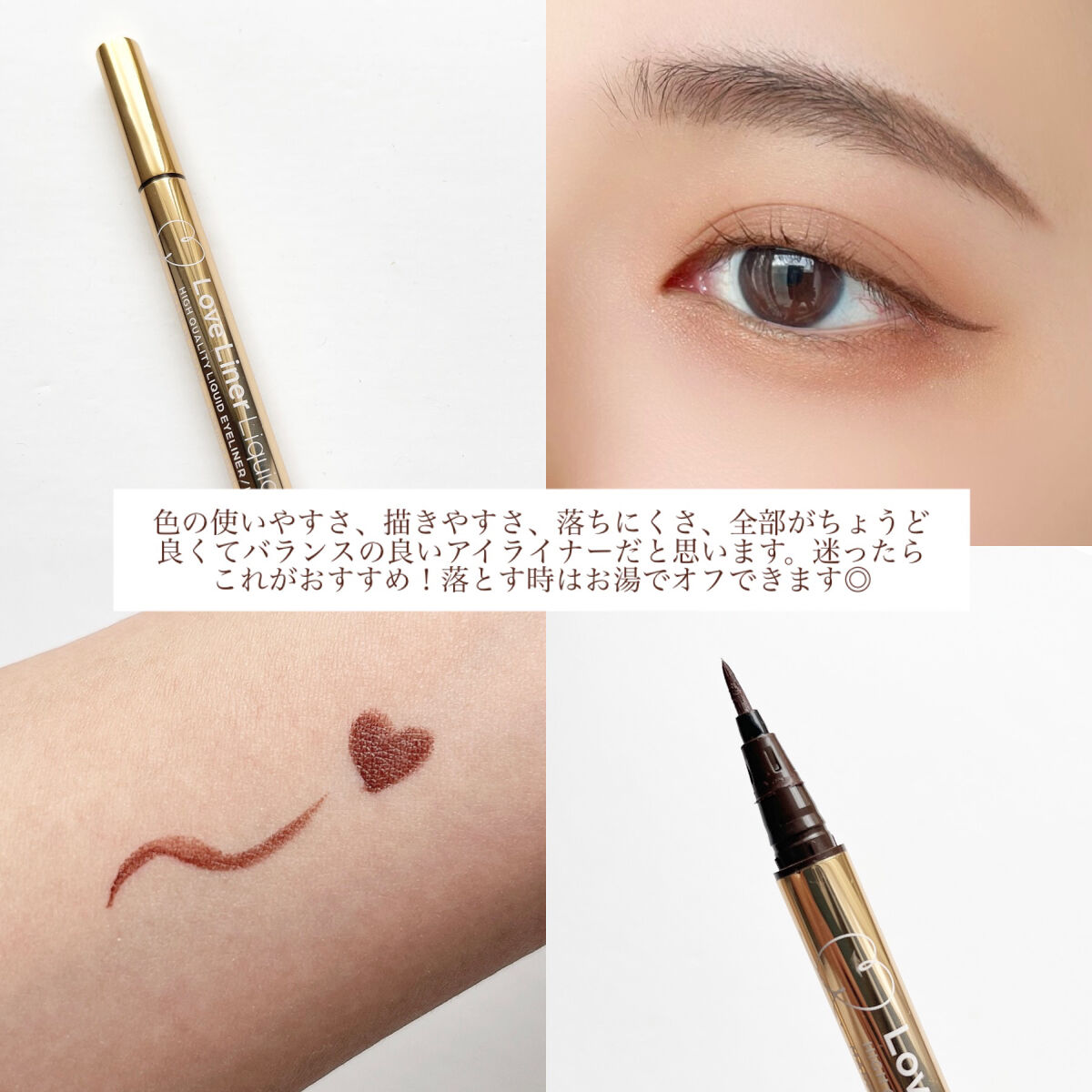 アイライナーはずっとラブライナー。ブラウンは締め色を強すぎない色にしたい方におすすめ。アイライナーはずっとラブライナー。適度な重みで手元が安定するのと、穂先がずっと綺麗で割れないのが良し。数年来使っていますが、色素沈着も感じません。滲んだり汚...