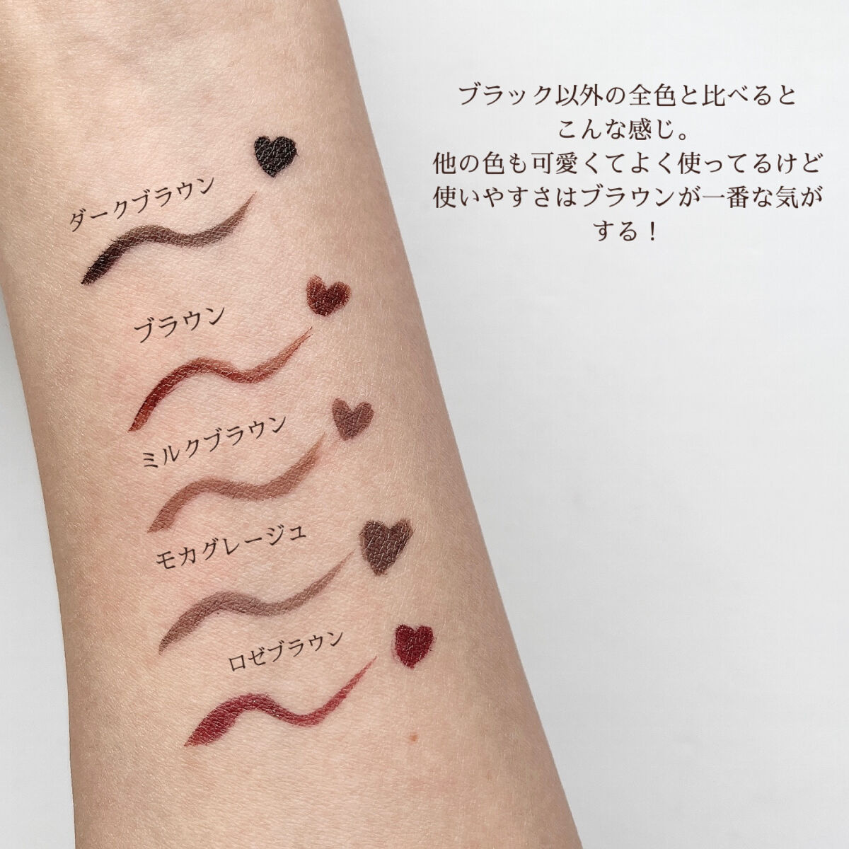 なめらかな書き心地で発色も良く、ブレずに描きやすい! パケに結構重さがあるので、安定してラインを引きやすいのが特徴です👌 めちゃくちゃ可愛かった〜!🥺 名前の通りミルクを加えたような、まろやかで優しい色味のブラウンです。 しっかり描いてもアイラインがっつり引いてます感が出ないので、ナチュラルに仕上げたい方にオススメです! 透け感があるので重たい印象にならなくて、ふんわり優しい雰囲気のアイメイクになります🕊𓈒𓏸◌ 発色が淡くて肌なじみが良いのではみ出してもわかりにくくて、適当にササッと引いても割と綺麗に仕上がる😂 ラブライナーは色素沈着しにくい顔料タイプなので、落とす時もストレスフリーでお気に入りです♪ 今回試しに眉毛もこのアイライナーで描いてみたんですが、発色淡めのなので意外と馴染んだ気がする…😂 個人的に結構お気に入りのアイライナー(兼アイブロウペンシル?笑)になりそう😳笑