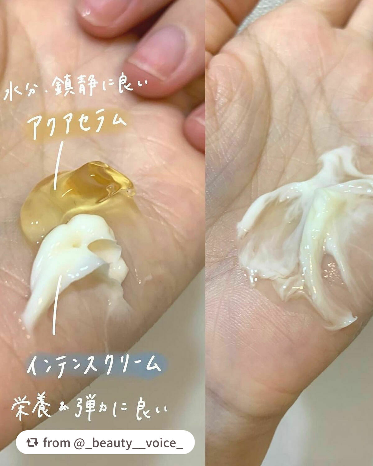 - アクサセラムとインテンスクリームのデュアル・フォーミュラで肌のタイプやコンディションに合わせて 比率を調節してカスタマイズ・ケアします。 ・アクアセラム:ヒアルロン酸、パンテノール、ツボクサエキス*が含まれた、さっぱりとした使用感で肌に水分を与え肌のキメを整えます。*ヒアルロン酸・パンテノール・ツボクサエキス(いずれも保湿成分) ・インテンスクリーム:イタリア産ホワイトトリュフ*が含まれた、もっちりした使用感で肌にうるおいを与えツヤのあるもち肌へ導きます。*ツベルマグナツムエキス(保湿成分) イタリアヴィーガン認証V-LABEL取得 皮膚低刺激テスト済み *全ての方に皮膚刺激が発生しないということではありません。 【使い方】 1. 洗顔後、スパチュラで肌のコンディションによって、セーラムとクリームを適量を取り、 ミックスしてから顔全体に優しく塗り広げ、 吸収させます。※ 必要に応じて、アクアセラムとインテンスクリームは単品でも使用できます。 【使用上の注意】 お肌に異常が生じていないかよく注意して使用してください。化粧品がお肌に合わないとき即ち次のような場合には、使用を中止してください。そのまま使用を続けますと、症状を悪化させることがありますので、皮ふ科専門医等にご相談されることをおすすめします。 (1)使用中、赤味、はれ、かゆみ、刺激、色抜け(白斑等)や黒ずみ等の異常があらわれた場合 (2)使用したお肌に、直射日光があたって(1)のような異常があらわれた場合