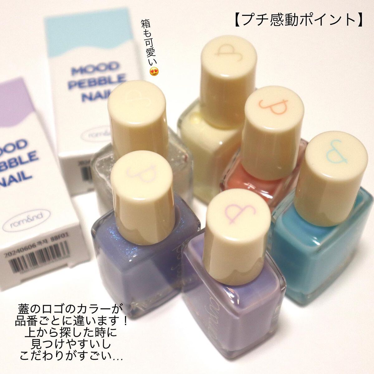 - 指先に玉石のような、ならかな光沢をとどめる。塗った瞬間から綺麗なツヤと光沢を維持し、重ねて塗っても透き通ったカラー感を鮮やかにとどめる、素早い乾燥力のナチュラルカラーネイル。「ロムアンド」の次世代型ネイルです。