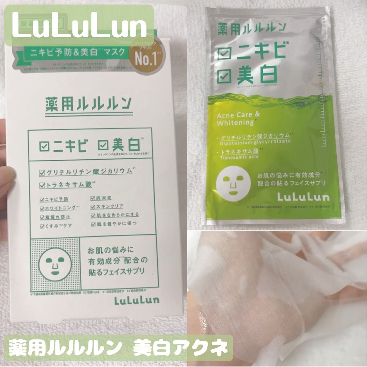 - 【医薬部外品】 ルルルン初の医薬部外品、「薬用ルルルン」が登場。 「薬用ルルルン 美白アクネ」はニキビを予防したい方、美白※1・くすみ※2をケアしたい方におすすめ。 (※1 メラニンの生成を抑えて、シミ・そばかすを防ぐ ※2乾燥による)