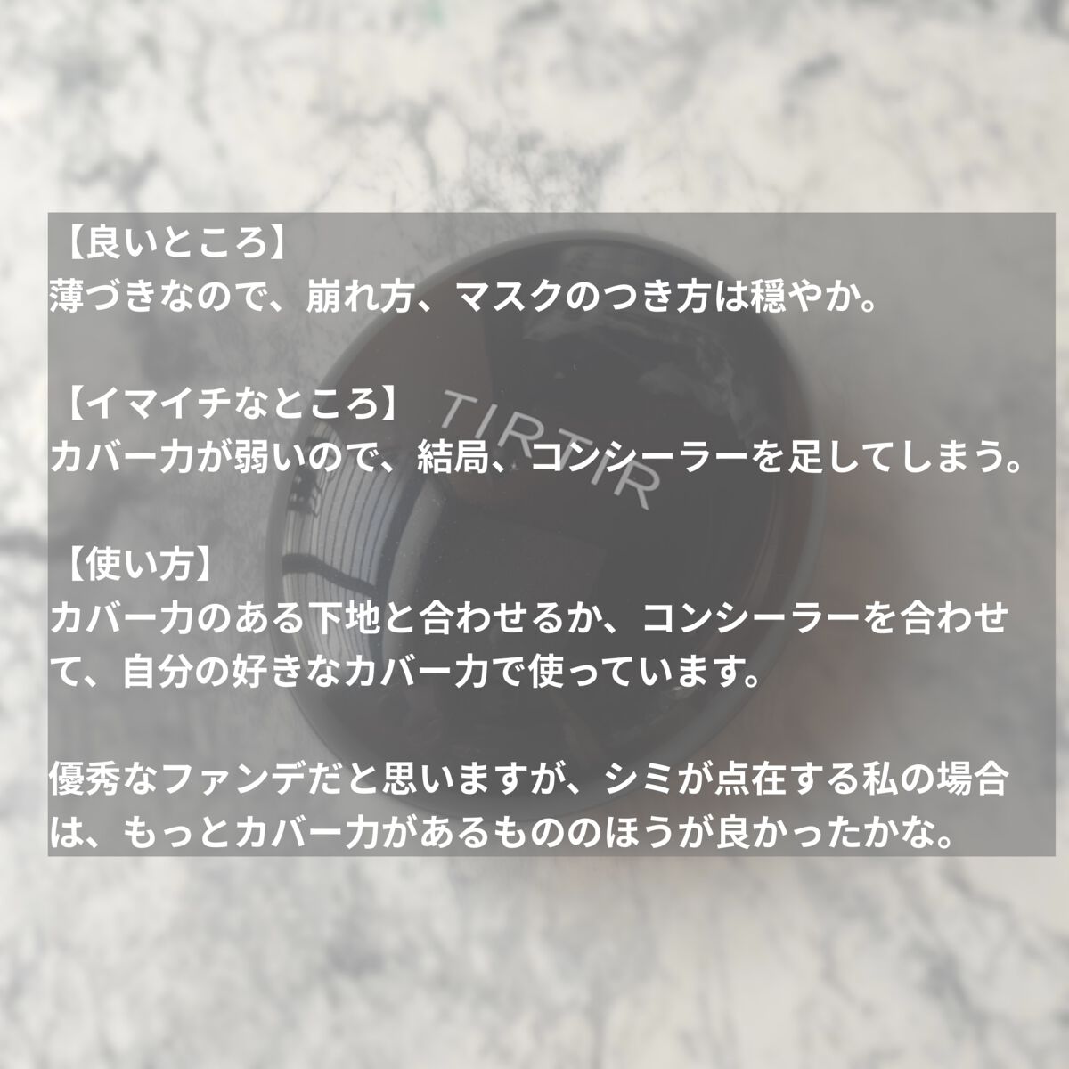 【使った商品】TIRTIRMASKFITREDCUSHION23NSAND【崩れにくさ】天才【カバー力】良いと思う【ツヤorマット】艶?だと思う【良いところ】厚塗り感でない【イマイチなところ】濃いシミや主張激しい毛穴は無理かなお試しに小さいサ...