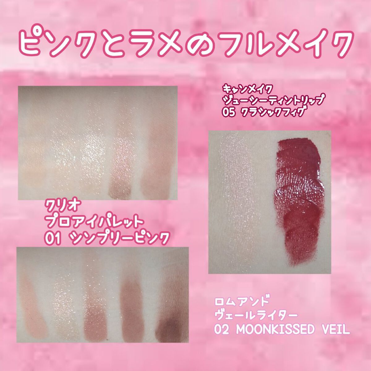 このメイクめちゃめちゃ盛れました! 全体的にピンクで統一して、甘めなメイクにしました!❥❥ ピンクシャドウは、瞼の広範囲に塗りすぎると腫れぼったく見えてしまうので、ベースカラーを広げたあと、メインカラーはあえて目尻のみに使うのがポイントです☆☆ グリッターを黒目の下に仕込むと、派手になることなく、裸眼でもうるうるきゅるきゅるなおめめになります🥺←こんな感じ笑 ボリュームタイプなので、まつげの存在感がまし目力がアップします。ダマになりやすいのでつけすぎ注意です…⚠ ラスティングリキッドアイライナー、4月くらいに出た限定色なのですが絶妙なくすみピンクグレージュで、このアイシャドウにドンピシャでした! いい感じに目元を締めてくれて、目尻にニュアンスがプラスされておしゃれになります💕 この投稿が役に立ったなと思ったら、いいね、クリップ、コメント等していただけると嬉しいです♡