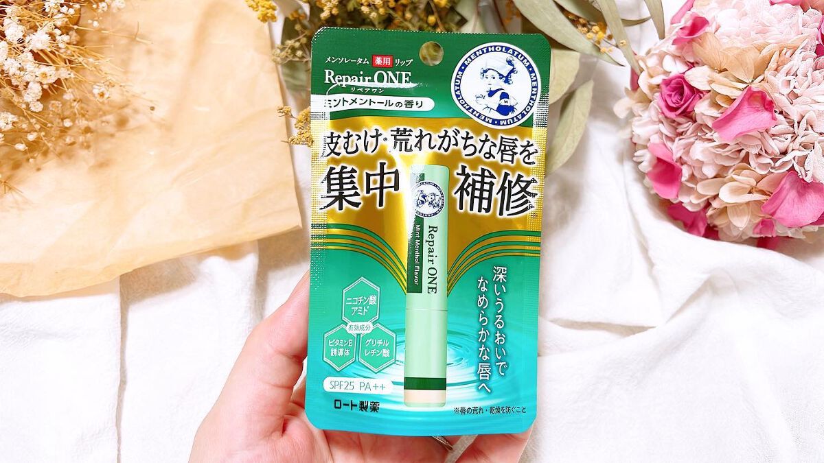 メンソレータムリペアワン ミントメントールの香り2.3g❀❀❀いつものド定番リップとは違って少しやわらかくて優しいリップ唇にスルスルスルッと塗りやすい♡しっとり感して潤われてるのがわかります♪❀❀❀皮むけ、荒れがちな唇に集中補修1本でできる薬...