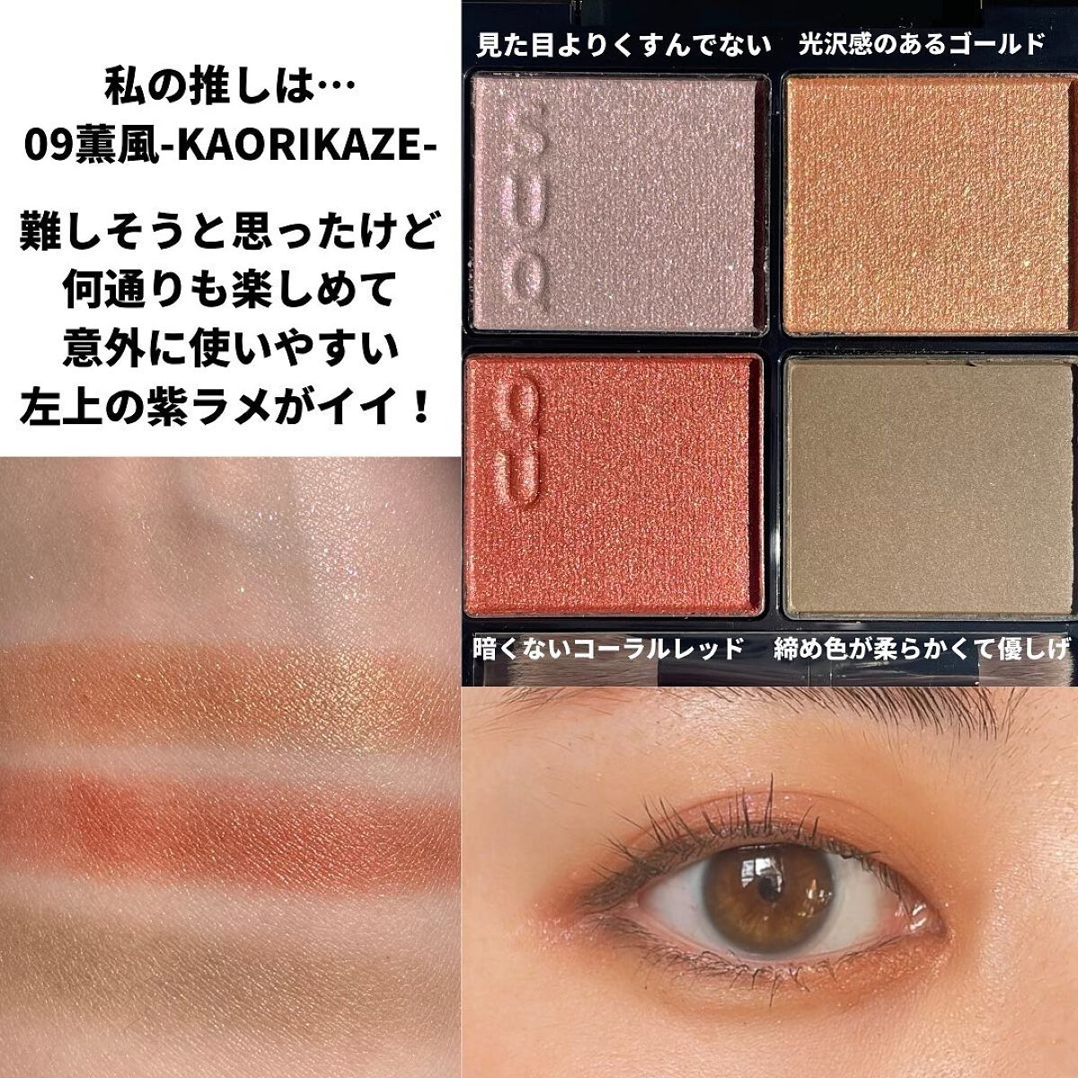 粉質がとにかくしっとり…!デパコスで感じるやつ…! どのパレットもブラウンベースで普段使いしやすいカラー展開です。 オレンジベースにシルバーラメが混ざっていたり コーラルベースにローズピンクやココアブラウンが混ざっていたり! あまり偏らずに使えるのがこれまた好きなポイントっ🫶 かっこいい雰囲気ならウインターグレイ、女性的な雰囲気ならティーローズ、大人っぽいならイノセントピーチ、カジュアルならオレンジアーモンド パーソナルカラー分からないよ〜という方は 過去投稿に似合うコスメを選ぶポイント上げているのでやってみてね🥰