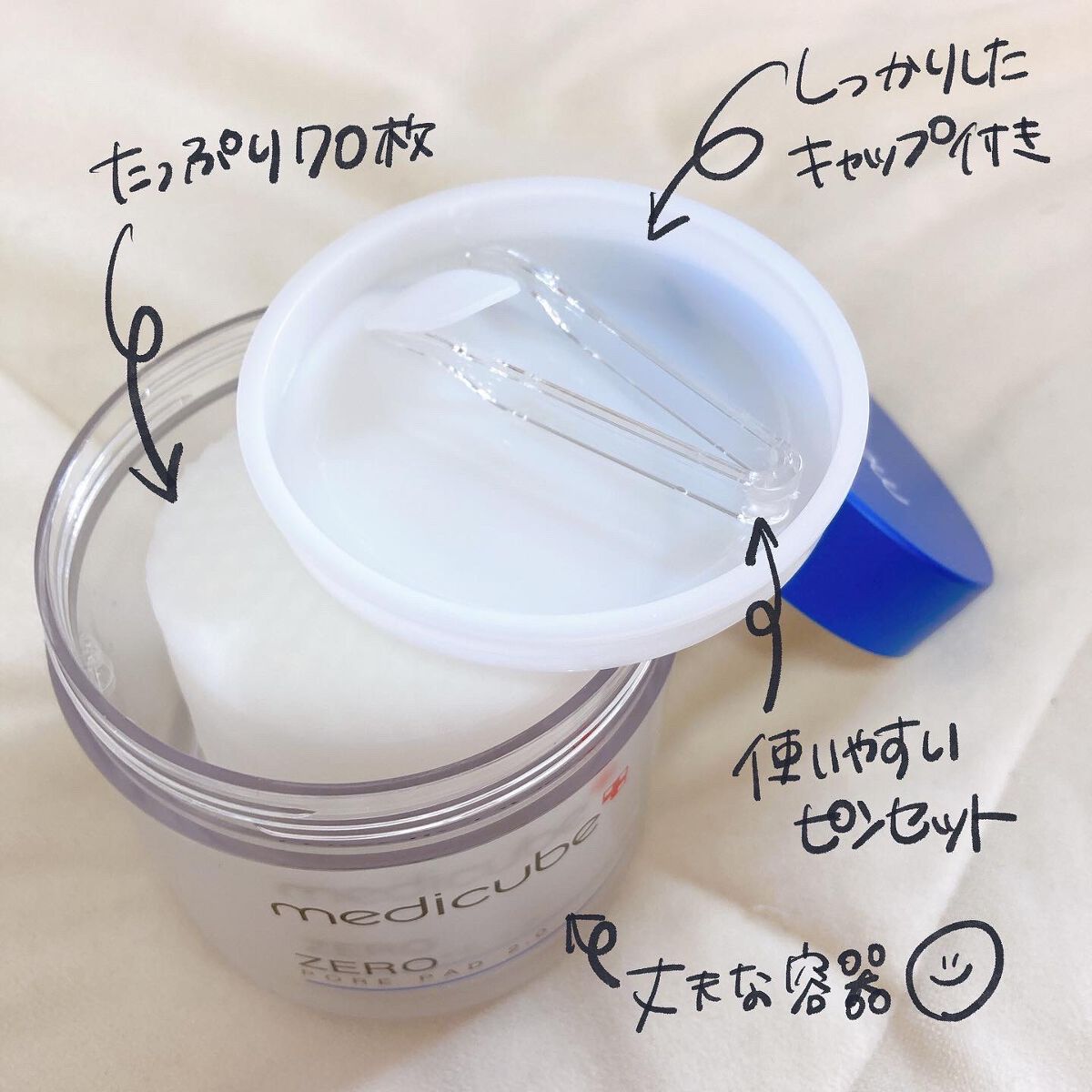 @medicube_officialjapan様より、ゼロ毛穴パッドをいただきました。しっかりしたジャーに入っています。ピンセット付きなので、一枚一枚取り出しやすく、使いやすいです。手に持ちやすいちょうど良いサイズ感のトナーパッド。エンボス加...
