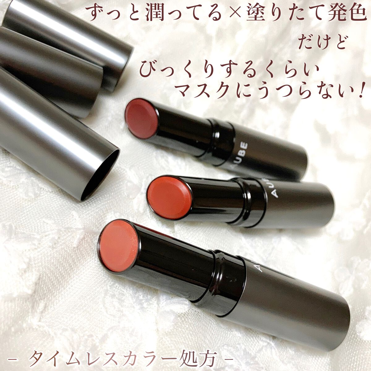 - マスクでも、色落ちにくい。*1 つけた瞬間の発色がつづく、タイムレスカラー処方。*2 これ一本でメイクしたての印象そのままに。 *1 マスクへの色移りがないわけではありません。 *2 唇への密着を高め、色落ちを防ぐカラーフィックスオイル配合