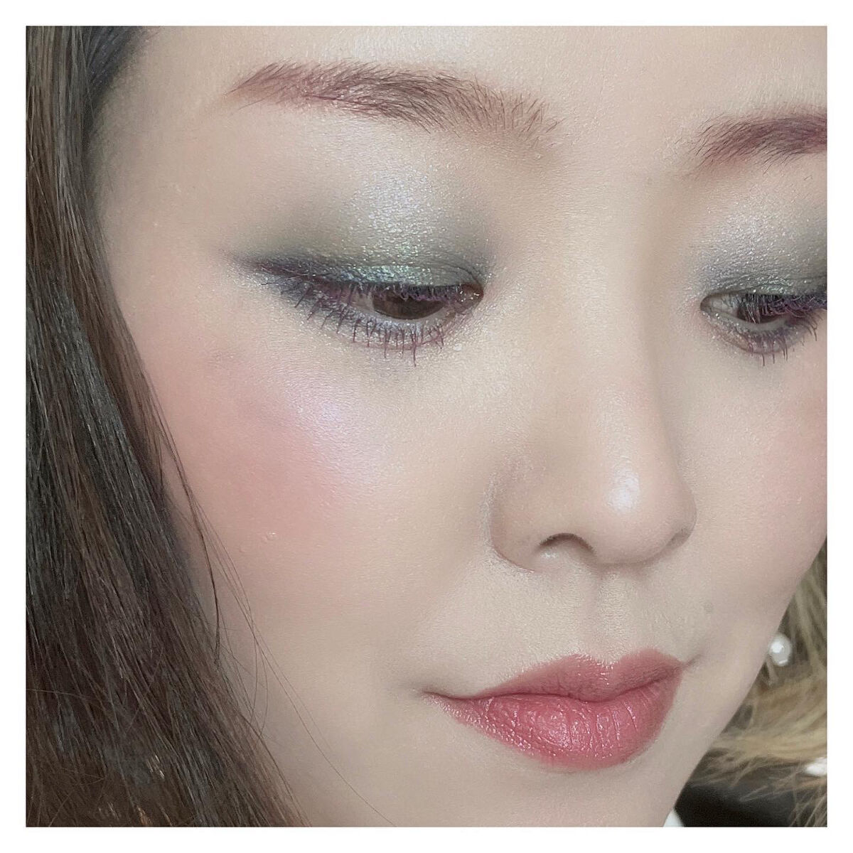 チークポップ持ってる人なら分かると思いますが、パール感は強め。 指で濃いめにつけてるので実際ブラシにとってつけるともっと薄めでモーヴカラー。 白っぽいパールなので見た目より明るめの発色。