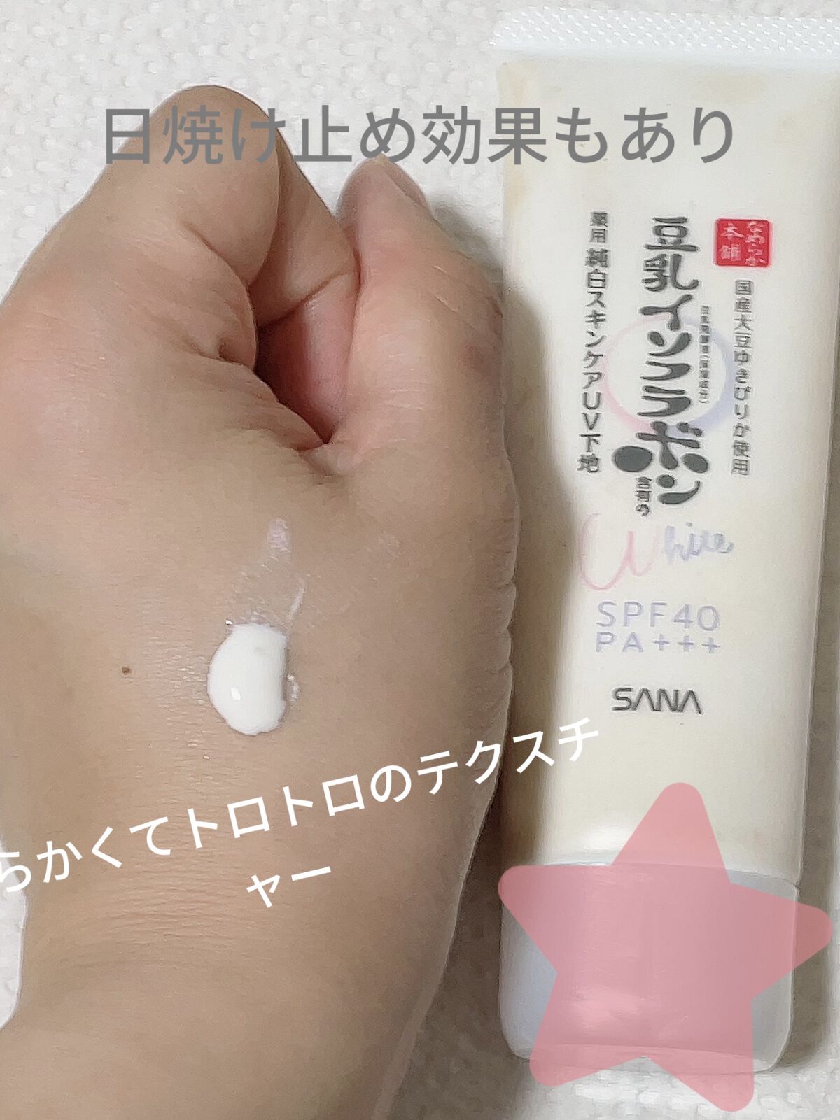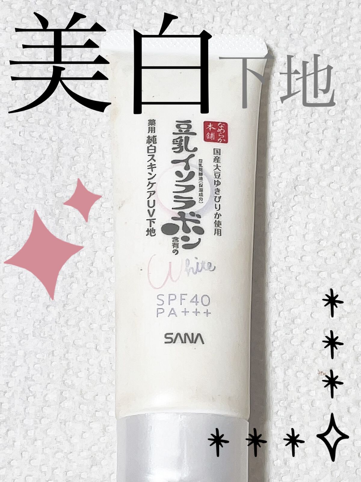 - <薬用美白スキンケアUV下地> 豆乳の美白スキンケアUV下地。肌荒れ&ニキビ予防しながら美白!メラニンの生成を抑え、シミ・そばかすを防ぎます。トーンアップ(メイク効果による)&皮脂崩れ防止。化粧水・美容液・乳液・クリーム・UVカット・化粧下地の1本6役。SPF40・PA+++。[販売名:サナ なめらか本舗 薬用美白スキンケアUV下地]