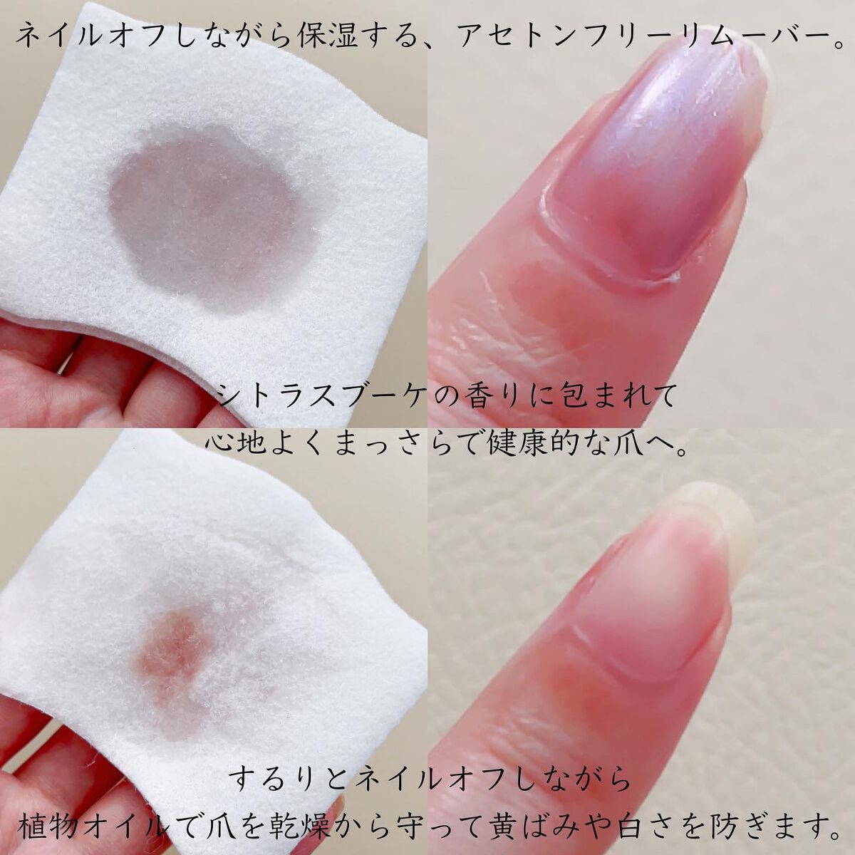 - オフとケアを同時に叶える アセトンフリーネイルリムーバー 美しく彩るキャンバスをまっさらに ネイルオフしながら保湿する、アセトンフリーリムーバー。するりとネイルオフしながら、植物オイルで爪を乾燥から守って黄ばみや白さを防ぎます。シトラスブーケの香りに包まれて、心地よくまっさらで健康的な爪へ。