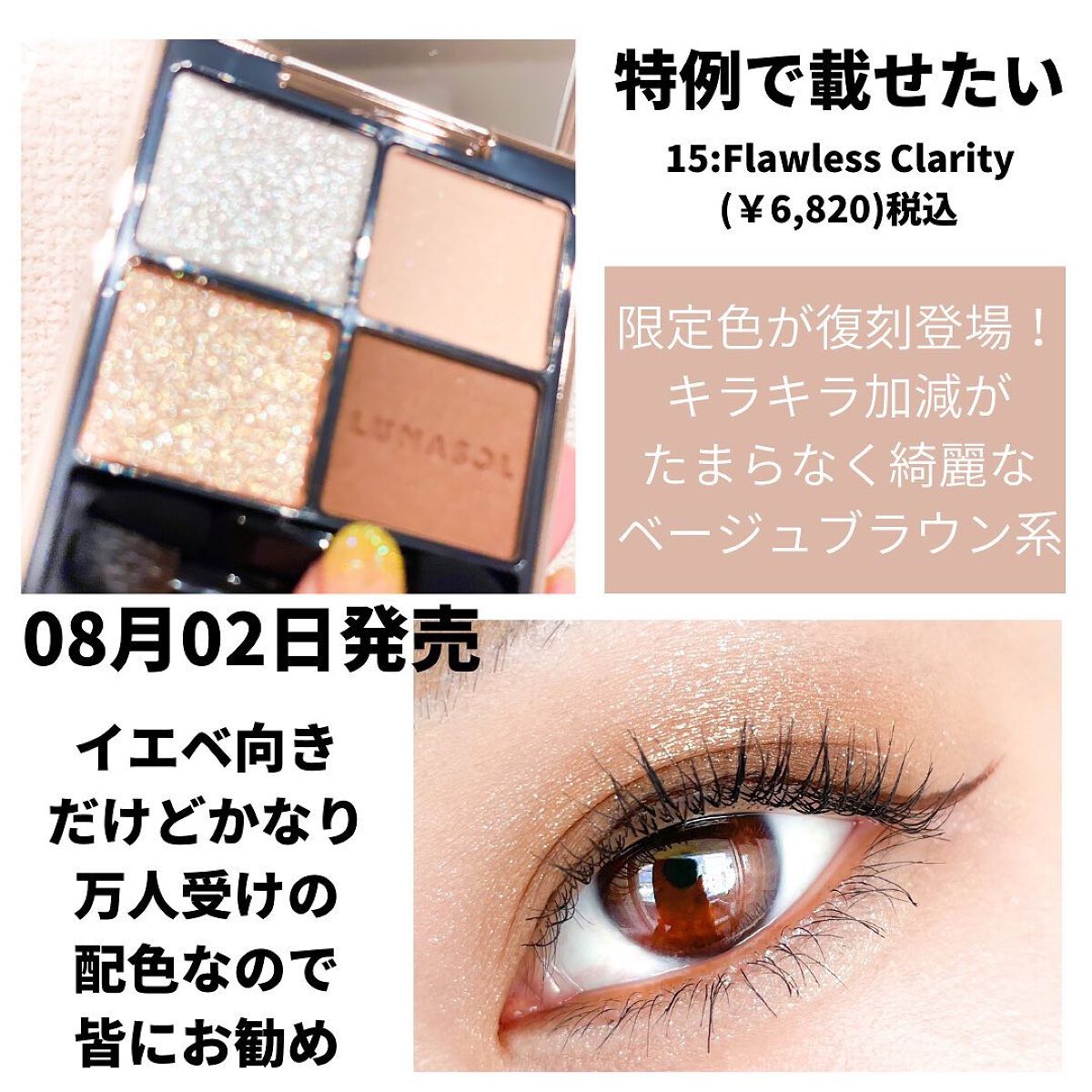 - 息をのむほどにあざやかな色や、繊細なニュアンスを秘めた色。たっぷりのきらめきを詰めこんだ質感や、マットで端正な質感。個性豊かな色や質感を自由に遊べる、4色セットのアイシャドウ。美しい配色が、溶けこむようにまぶたを彩って、立体的なまなざしへ。 昨年に限定発売し人気となりました、 アイカラーレーション EX12 Flawless Clarityが、「アイカラーレーション 15 Flawless Clarity」 定番カラーとして復刻発売!