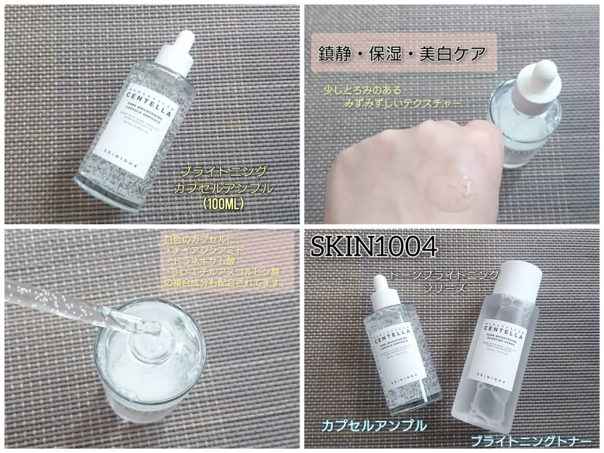 敏感肌でも明るく輝く肌へ導く美容液.ᐟ.ᐟ 輝く透明感”✕鎮静*=SKIN1004トーンブライトニング CICA成分”が肌をやさしく鎮静”し 明るく輝くツヤ肌を叶えるSKIN1004トーンブライトニングライン◡̈⋆ 少しトロッとしたテクスチャーで、とても伸びが良いです◎ 中に白いカプセルが沢山入っていて、肌に乗せて馴染ませていくと、だんだんカプセルが溶け出してお肌に浸透していってくれます.ᐟ.ᐟ