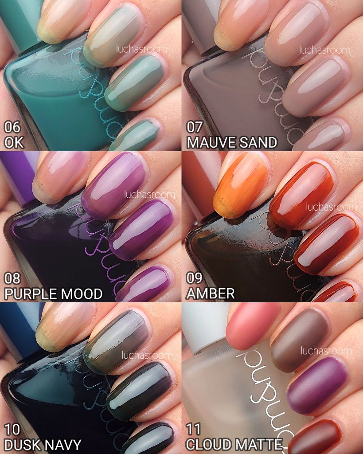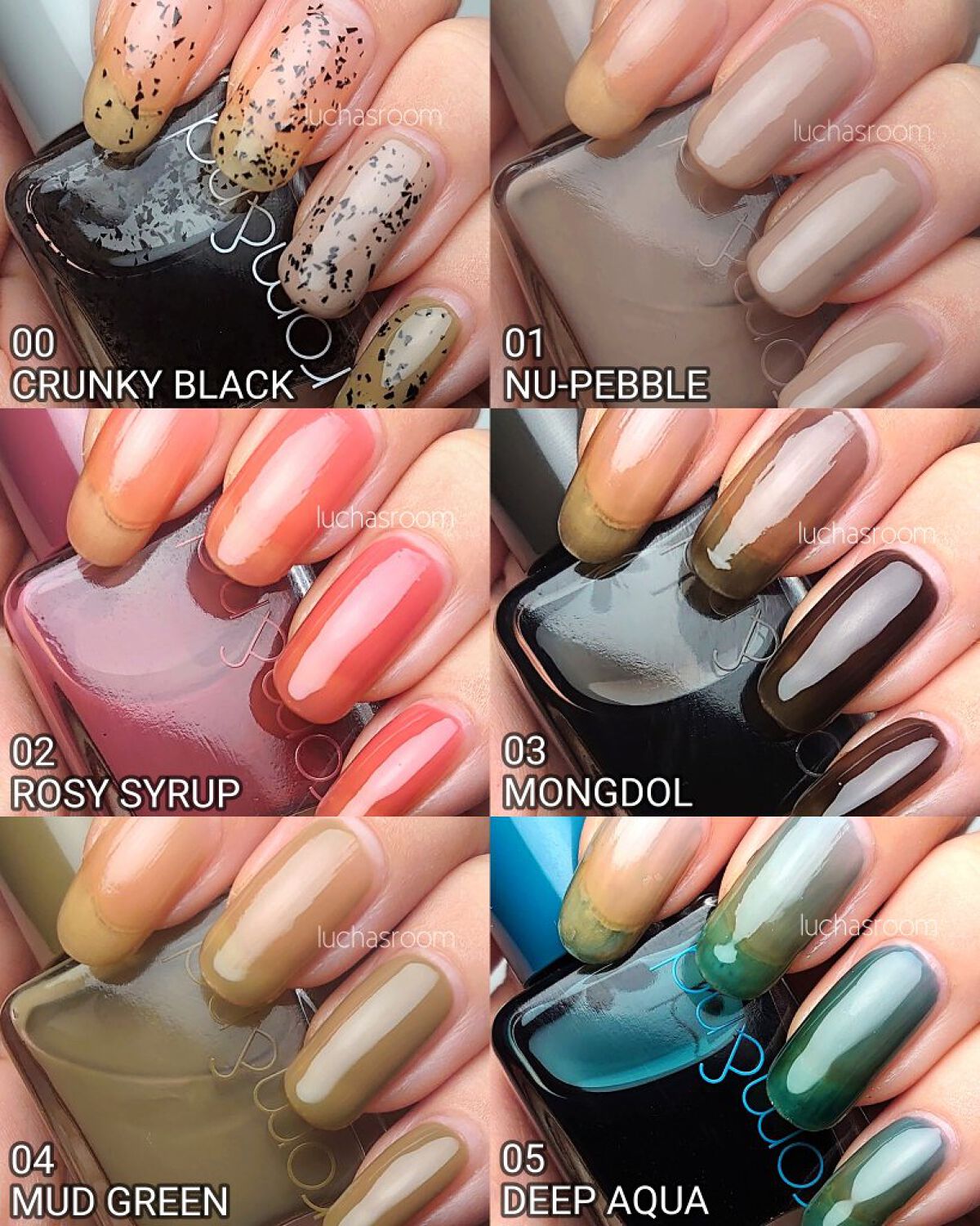- <00 CRUNKY BLACK(クランキーブラック)> 酢酸ブチル、ニトロセルロース、酢酸エチル、ジ安息香酸DPG、イソプロパノール、アクリレーツコポリマー、ジメチルシリル化シリカ、PET、カンフル、オクトクリレン、ポリウレタン-11、カーボンブラック、Al <01 NU-PEBBLE(ヌーペブル)> 酢酸ブチル、酢酸エチル、ニトロセルロース、イソプロパノール、クエン酸アセチルトリブチル、アクリレーツコポリマー、(アジピン酸/ネオペンチルグリコール/無水トリメリト酸)コポリマー、ジ安息香酸DPG、エタノール、ステアラルコニウムベントナイト、(スチレン/アクリレーツ)コポリマー、酸化チタン、オクトクリレン、ブタノール、カンフル、メトキシケイヒ酸エチルヘキシル、ジ安息香酸トリメチルペンタンジイル、酸化鉄、黄4、ポリビニルブチラール、エチルセルロース、カーボンブラック、赤201、ステアラルコニウムヘクトライト <03 MONGDOL(モンドル)> 酢酸ブチル、ニトロセルロース、酢酸エチル、イソプロパノール、アクリレーツコポリマー、ジ安息香酸DPG、エタノール、カンフル、ジメチルシリル化シリカ、オクトクリレン、メトキシケイヒ酸エチルヘキシル、エチルセルロース、カーボンブラック、クエン酸アセチルトリブチル <04 MUD GREEN(マッドグリーン)> 酢酸ブチル、酢酸エチル、ニトロセルロース、イソプロパノール、クエン酸アセチルトリブチル、アクリレーツコポリマー、(アジピン酸/ネオペンチルグリコール/無水トリメリト酸)コポリマー、ジ安息香酸DPG、エタノール、ステアラルコニウムベントナイト、(スチレン/アクリレーツ)コポリマー、オクトクリレン、ブタノール、カンフル、酸化チタン、メトキシケイヒ酸エチルヘキシル、黄4、ジ安息香酸トリメチルペンタンジイル、ポリビニルブチラール、酸化鉄、エチルセルロース、カーボンブラック、コンジョウ、ステアラルコニウムヘクトライト <05 DEEP AQUA(ディープアクア)> 酢酸ブチル、ニトロセルロース、酢酸エチル、イソプロパノール、アクリレーツコポリマー、ジ安息香酸DPG、エタノール、カンフル、ジメチルシリル化シリカ、オクトクリレン、メトキシケイヒ酸エチルヘキシル、(スチレン/アクリレーツ)コポリマー、クエン酸アセチルトリブチル、コンジョウ、エチルセルロース、カーボンブラック <06 OK(オク)> 酢酸ブチル、酢酸エチル、ニトロセルロース、イソプロパノール、クエン酸アセチルトリブチル、アクリレーツコポリマー、(アジピン酸/ネオペンチルグリコール/無水トリメリト酸)コポリマー、ジ安息香酸DPG、エタノール、ステアラルコニウムベントナイト、(スチレン/アクリレーツ)コポリマー、オクトクリレン、ブタノール、カンフル、酸化チタン、メトキシケイヒ酸エチルヘキシル、ジ安息香酸トリメチルペンタンジイル、ポリビニルブチラール、コンジョウ、エチルセルロース、黄4、カーボンブラック <08 PURPLE MOOD(パープルムード)> 酢酸ブチル、ニトロセルロース、酢酸エチル、イソプロパノール、アクリレーツコポリマー、ジ安息香酸DPG、エタノール、カンフル、ジメチルシリル化シリカ、オクトクリレン、グンジョウ、クエン酸アセチルトリブチル、(スチレン/アクリレーツ)コポリマー、メトキシケイヒ酸エチルヘキシル、赤201、エチルセルロース、ステアラルコニウムヘクトライト、カーボンブラック <02 ROSY SYRUP(ロージーシロップ)> 酢酸ブチル、ニトロセルロース、酢酸エチル、イソプロパノール、アクリレーツコポリマー、ジ安息香酸DPG、エタノール、カンフル、ジメチルシリル化シリカ、オクトクリレン、酸化チタン、メトキシケイヒ酸エチルヘキシル、(スチレン/アクリレーツ)コポリマー、クエン酸アセチルトリブチル、酸化鉄、赤201、エチルセルロース、水酸化Al、カーボンブラック、メチコン、ステアラルコニウムヘクトライト <07 MAUVE SAND(モーブサンド)> 酢酸ブチル、酢酸エチル、ニトロセルロース、イソプロパノール、クエン酸アセチルトリブチル、アクリレーツコポリマー、(アジピン酸/ネオペンチルグリコール/無水トリメリト酸)コポリマー、ジ安息香酸DPG、エタノール、ステアラルコニウムベントナイト、(スチレン/アクリレーツ)コポリマー、オクトクリレン、ブタノール、カンフル、酸化チタン、メトキシケイヒ酸エチルヘキシル、ジ安息香酸トリメチルペンタンジイル、酸化鉄、ポリビニルブチラール、エチルセルロース、カーボンブラック、赤201、ステアラルコニウムヘクトライト
