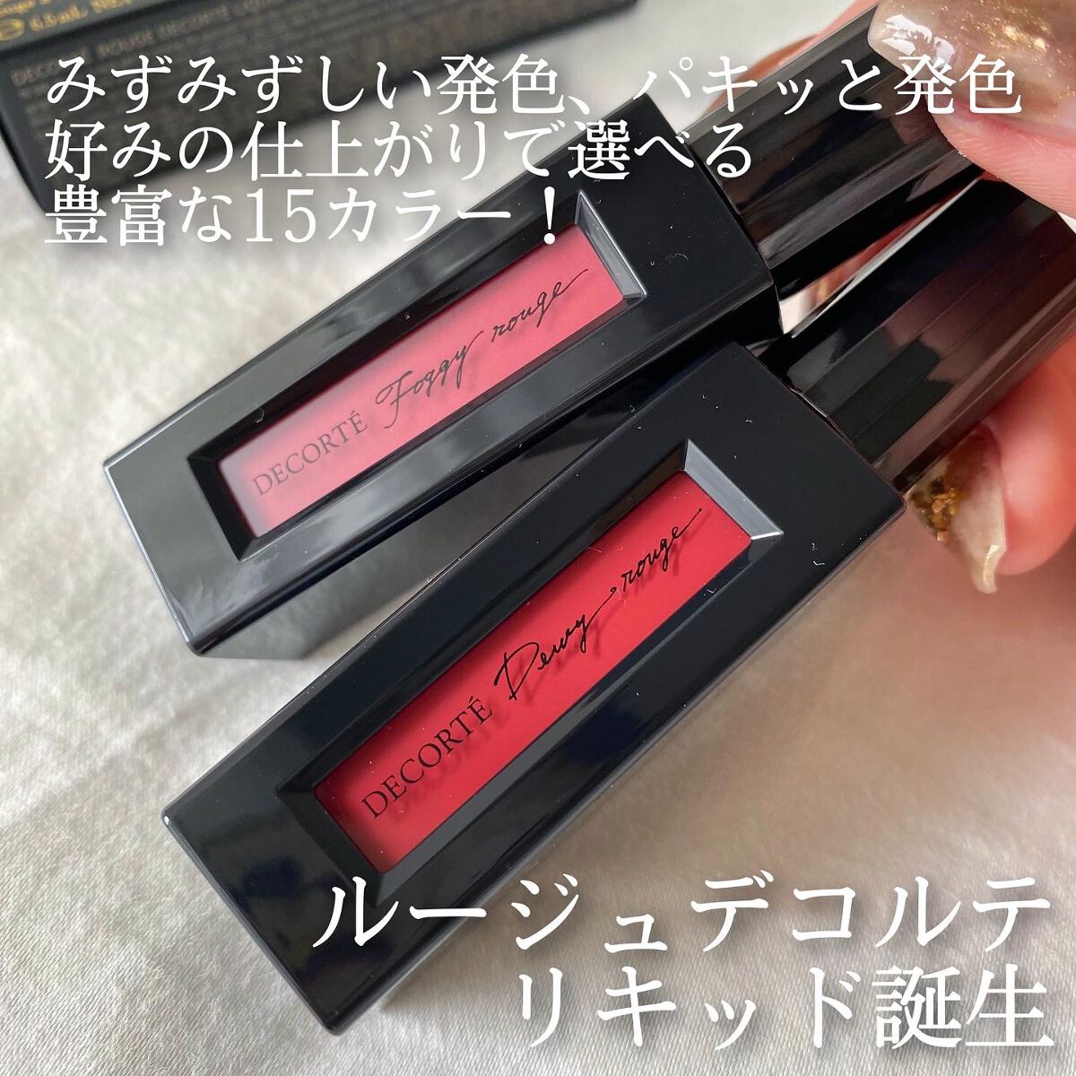 - 無意識に、美しさつづく。 軽やかで心地いい、 艶とマットのスキンケアルージュ。 独自のテクノロジーで“肌を美しく魅せる”ことにこだわり、 自らをエンパワーするような豊富なカラー展開の 「ルージュ デコルテ」から、 唇に纏うあいだ、ずっと軽やかなうるおいに満たされ続けるような心地よさの 「ルージュ デコルテ リキッド」が誕生します。 コスメデコルテならではの、 うるおいと彩りを長時間持続させる 「ハイパフォーマンスカプセル処方」を採用し、 高いラスティング効果を実現。 唇への心地よさと塗りやすさにこだわった平型形状のチップで、 ひと塗りで美しく均一な塗布膜を叶えます。 Dewy rouge (デューイ ルージュ ) 素の唇と一体化するような、生きた艶。 みずみずしく軽やかなタッチで濃密な発色を叶え、 美しい仕上がりと心地よさが続くリキッドルージュ。 01 signature red / 06 urban wear / 07 warm maple / 08 bitter lips / 09 for luck / 10 vivid memory / 11 departure time / 12 star spice /13 spring coral /14 skin rose Foggy rouge(フォギー ルージュ) 50秒で、二次付着レス。 加湿されているような心地よさで唇を彩り、 つけたてのマットな高発色が持続する、 トランスファープルーフのリキッドルージュ。 05 signature red / 15 be stylish / 16 cassis dolce /17 mannish lady / 18 dried flower