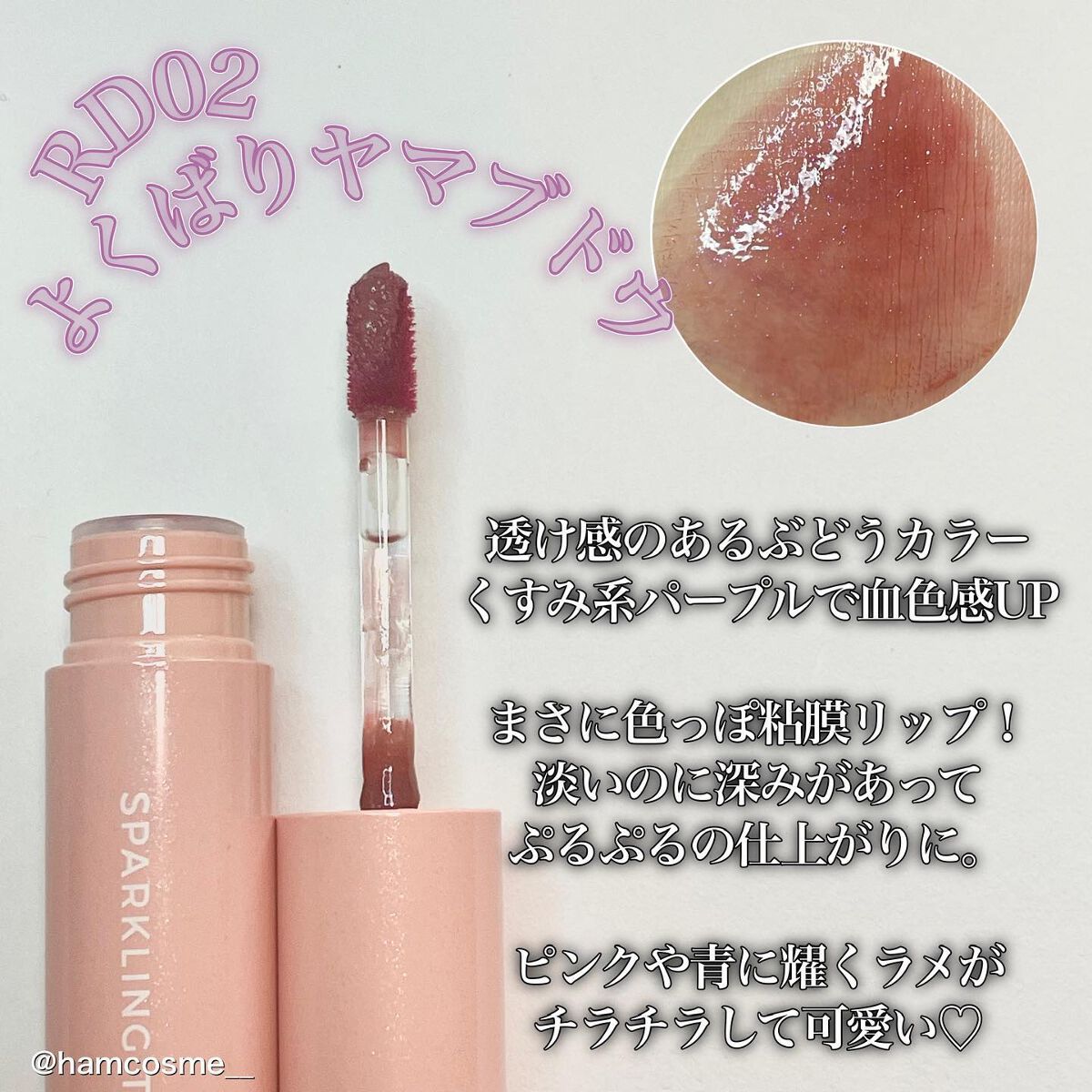 - Point 1 ジューシーなもぎたて果実のような発色が長時間続く Point 2 キラキラ輝くスパークリングジュエリーパウダー配合 Point 3 リップケアオイル配合で、クリアな光沢感のある仕上がり RD03、CR02は公式オンライン限定発売