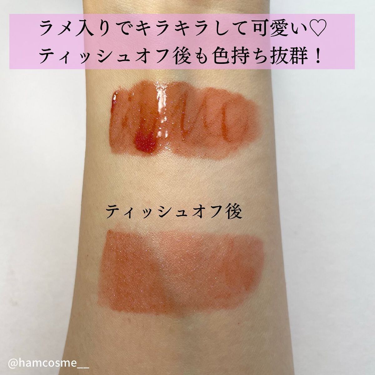 ヌーディカラーの透明感がある透き通ったような色づき。果汁シロップのようなぷるっと感なのにマスクにもつきづらくお値段もやさしいのでイチオシのリップです。 最初は2色だけと思っていたのですが、ヌーディーな可愛さに結局4色そろえてしまいました。似てるようで見比べると印象が全然変わるので気分でリップを変えてメイクを楽しんでいます💋 つやのある仕上がりでうるおいたっぷりの乾燥知らずのリップなのにティッシュオフしてもかなり色が残り、香りもいいので1本は試してみるのもオススメ!