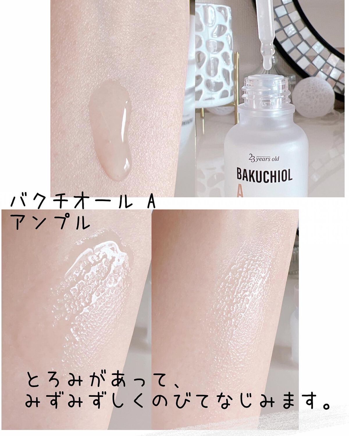 天然由来成分のレチノール、バクチオールを配合した肌に優しい爆力ケアが可能なアンプルです。 バクチオールはレチノールと同じ成分・効果でありながら、朝から夜までいつでも取り入れていただけます。 ややとろみのあるテクスチャーで、肌にスッとなじんで使いやすかったです☺️🧡