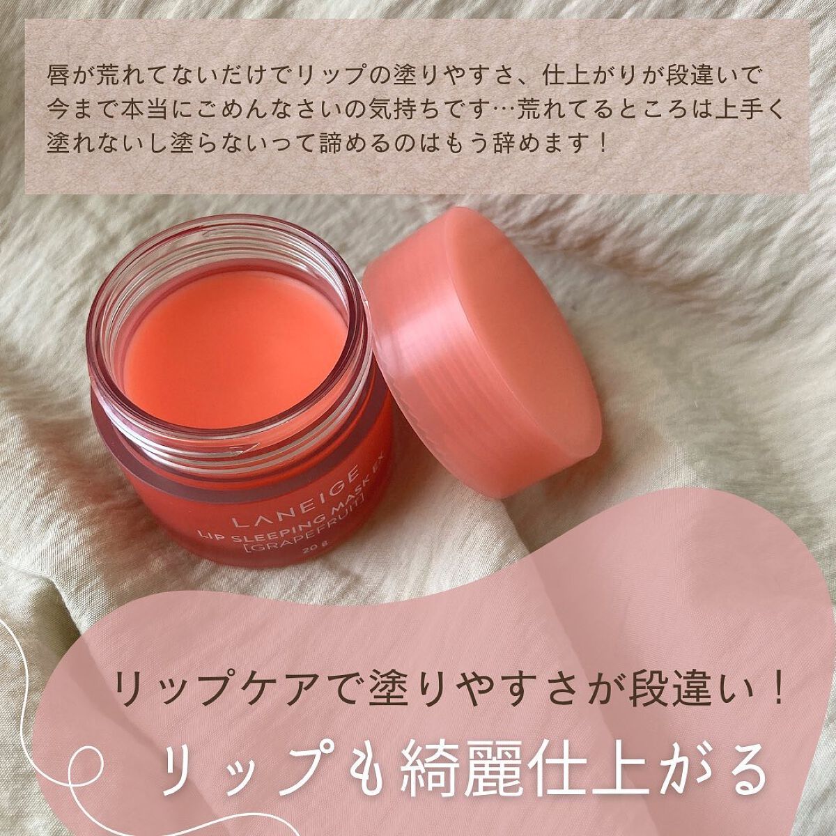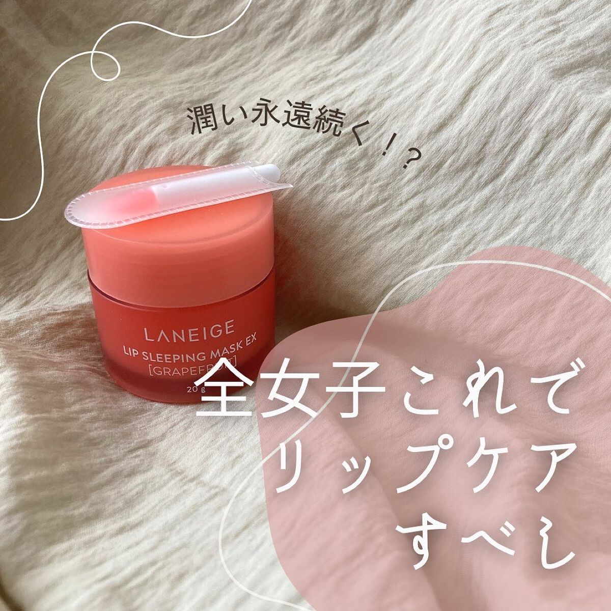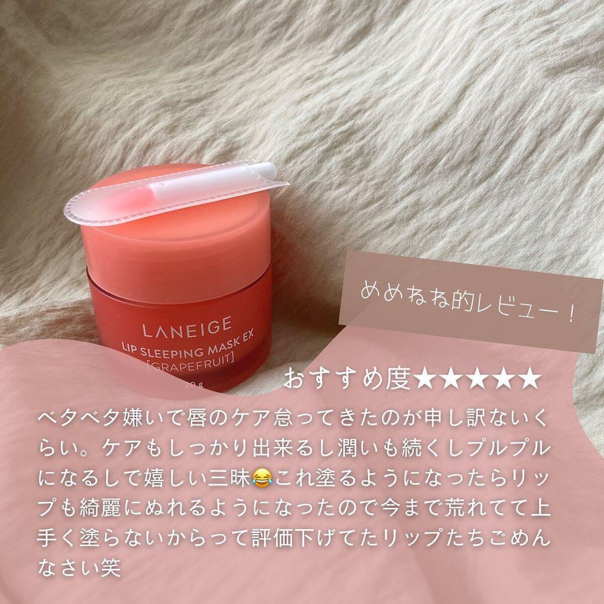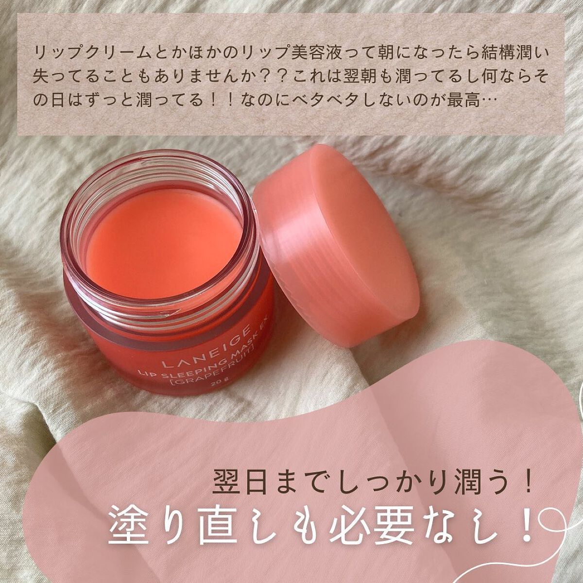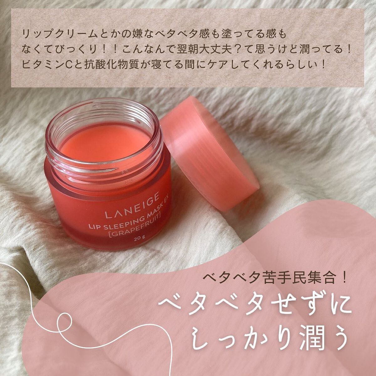 - 寝ている間にケアしてふっくらぷるぷるにうるおった唇へ。 2015年の初代発売以降、世界で2秒に1個売れている*¹LANEIGE大ヒットシリーズ *¹ 2024年グローバル販売実績 1.角質にアプローチするBerryFruitComplex (ベリーフルーツコンプレックス)*²が、 寝ている間に気になる乾燥や角質にうるおいを与え、つやのあるふっくらとうるおった唇に仕上げます。 *²ザクロ果実エキス、ブドウ果実エキス、ラズベリー果実エキス 2.ココナッツオイル(ヤシ油)を配合で、うるおいをあたえ睡眠中の乾燥を防ぎます。 3.今夜はどんな気分?5つのフレーバーから選べるワクワク感。 ■テクスチャー:やさしく馴染むなめらかなバームタイプ ■アレルギーテスト済み*³ *³全ての方にアレルギーが起こらないということではありません。 ■使用方法 寝る前に唇にたっぷり塗り、そのままお休みください。 翌朝、軽くティッシュオフします。付属のスパチュラで塗ることで、より唇の角質に馴染みやすくなります。 日中のリップトリートメントにも使用できます。