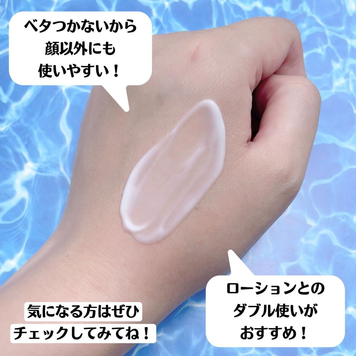 透明のとろみのあるテクスチャーで、スーッと肌に馴染み、ベタつきはなく、少しするとサラッとしてみずみずしい使い心地です✨ ハンドプレスすると、しっとりモチモチの肌になっているのを実感しました◎ 爽やかなシトラスの香りも癒されます💕 スポイトタイプなので、量も調節しやすく、衛生面も安心で使いやすいです!