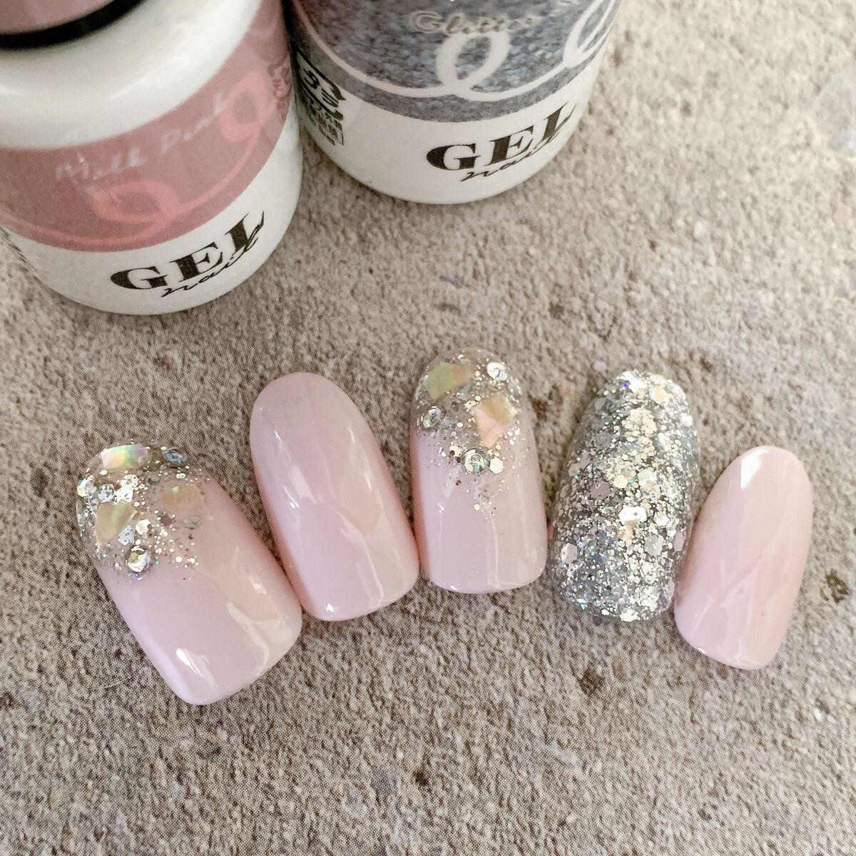 DAISOジェルでガラスネイルしてみました💅 ①ライトピンクを2度塗り ②ラメシルバーでフレンチ ③グリッターシルバーのホロをラメシルバーの上に重ねる 簡単にキラキラなガラスネイルができます〜🥰 そのままでも可愛いしパーツをつけても🙆🏻♀️ 参考になれば嬉しいです🎀