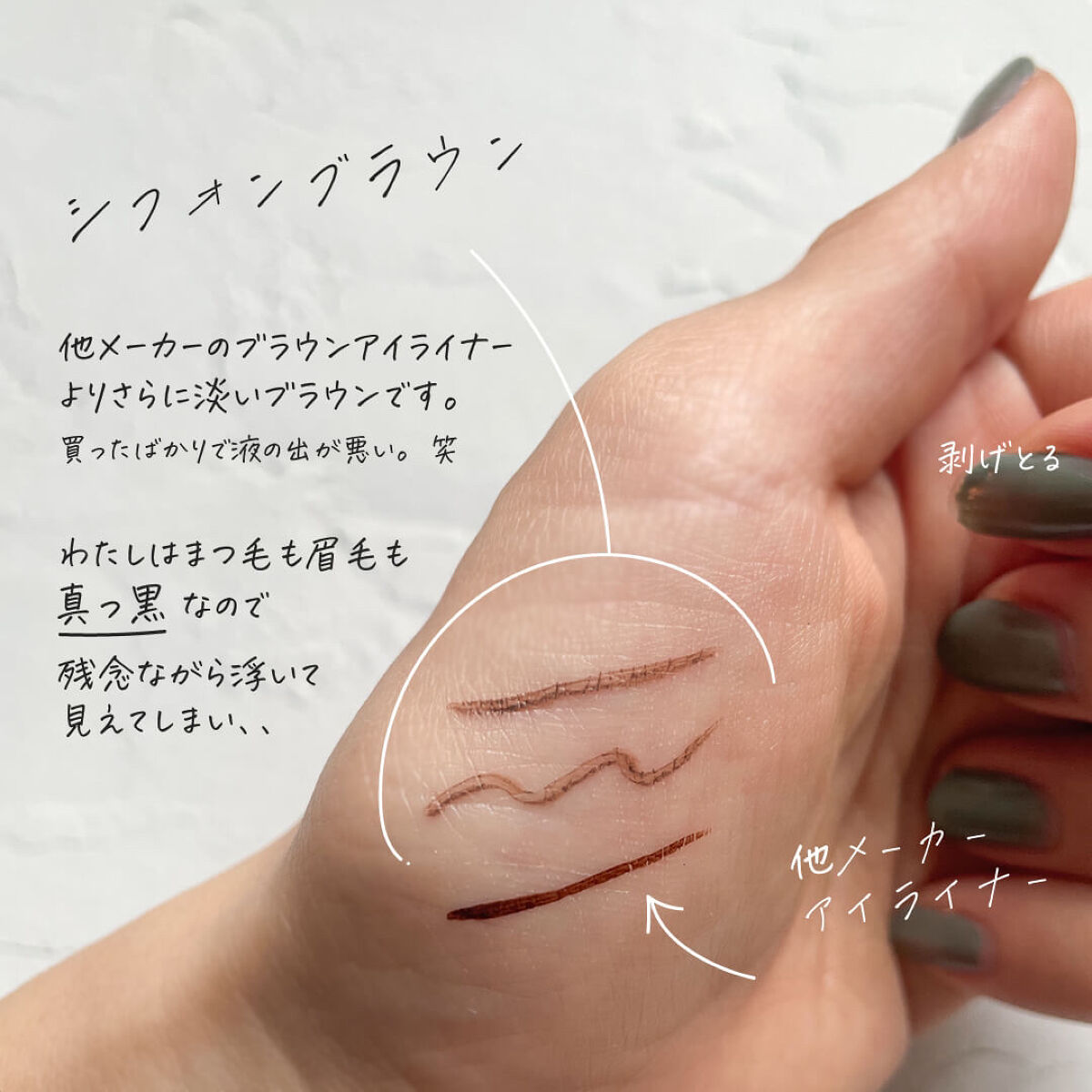 - 筆先までずっとなめらか、目尻で感動するリキッドアイライナー。 必要な量が肌にのる新設計で、まぶたの上をすべるような、滑らかな描き心地。しなやかでコシのある筆が、筆圧のコントロールを容易にし、太いラインも細いラインも思い通りに仕上げます。水、汗、涙に強いウォータープルーフタイプなのに、通常洗顔で簡単オフ。肌に色素が残らない顔料を使用。5種類の美容液成分を従来品の200%配合し、メイクしながら目元ケアまで。 ●ブラウンブラック ※2020年9月12日 バラエティショップ先行発売 ●漆黒ブラック ※2020年12月頃発売予定 ●ナチュラルブラウン ※2020年12月頃発売予定 ●シフォンブラウン 「毎日メイクに透明感と抜け感」 ブラウンでも、グレーでも、ベージュでもないニュアンスカラー。 自然な印影で素の目元を際立て、頑張りすぎない、ふんわりとした目元に。 ●アプリコットブラウン 「じゅわっと血色感。 肌に馴染むおしゃれカラー」 温かみのあるアプリコットがじゅわっと滲む血色感を目元に演出。 肌馴染みが良いので、カラーライナーに抵抗がある方もブラウンの延長線上で楽しめる、使いやすい色味です。 ”ちょっとオシャレ”な空気感を演出するカラー。 ●ピンクショコラ アイライナー 「ピンクが溶け込む濃厚ブラウン」 肌馴染みが良く、目元にじんわり血色感をプラス。 さりげなく女性らしさが加速するようなカラー。 ●ピスタチオラテ (2022年7月29日(金)発売) 「“目尻”に抜け感アクセント」 肌に馴染むのに映える絶妙なグリーン。 トレンドカラーに“くすみ”と“抜け感”をプラスしたまろやかな発色。 ●マスタードブラウン 「“イエロー”が揺れる、大人の洒落色」 (2022年7月29日(金)発売) まるで太陽のような暖かさを感じる新しいブラウン。 ほんのり感じるイエローでメイクが一気に垢抜ける稀有な色。 ●シフォンピンク(2023年2月10日発売) 「ふんわり柔らか"まろみピンク"」 甘くなりすぎない青みニュアンスで目元の透明感UP。 目元を引き締め、ピンクメイクにありがちな腫れぼったさを解消。 ●ミルクカプチーノ(2023年4月21日発売) まろやかな深みの“優しい締め色” どんなメイクにも合わせやすいカラー。 自然な陰影でさりげなく目幅を拡張します。 ●グレーカシミア(2023年10月1日発売) ブラウンがほんのり溶け込んだ、暖色グレー まろやかな発色で、パーソナルカラーを問わず肌に馴染む 目元の陰影になりすまし、抜け感と目力を欲張りに叶える ●ダークフィグ(2024年6月1日発売) するする”なめらか。描きやすいのに、落ちにくい。 クッキリ可愛いほの甘ダークブラウン ●ピーチモカ(2024年8月1日発売) ふわっと自然に盛れる“桃色ブラウン” ほんのり血色感で目元にうるみ感を演出 ●スターダストブラウン(2024年12月11日発売) キラッと繊細に輝く''星屑ブラウン'' 透け感のあるダークブラウンの色味とラメの輝きが、目元に艶のある立体感を演出 ●チャコールモカ(2025年4月10日発売) 目元を締める''深みグレージュ'' 黄みや赤みに偏りすぎない絶妙な色設計で、自然に目元を強調