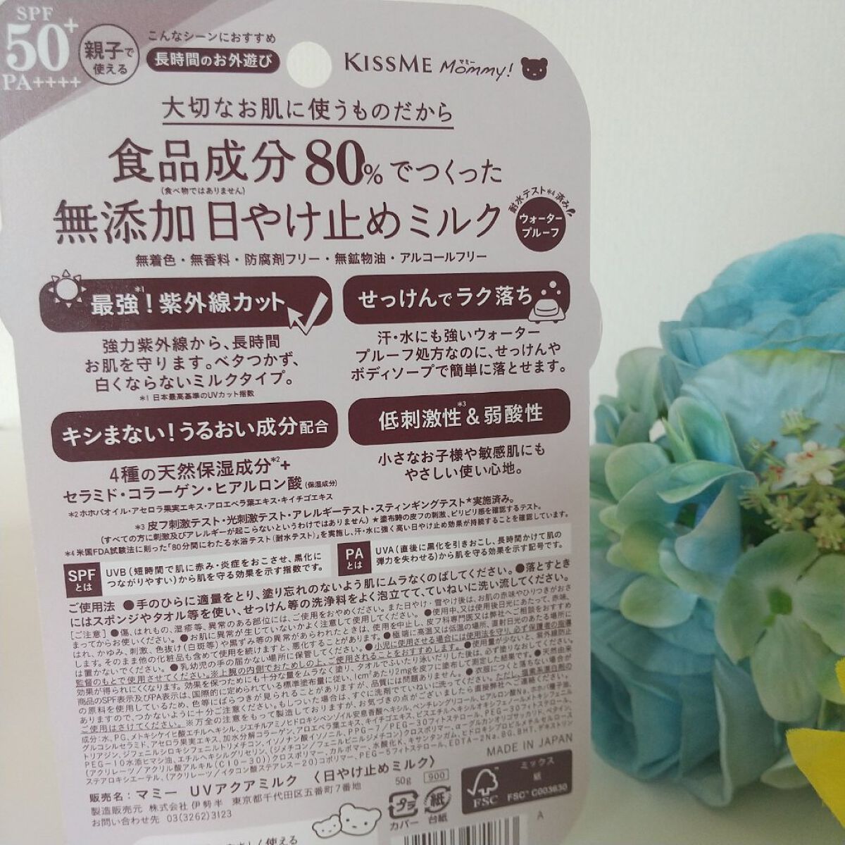 KISSMEマミーUVアクアミルク『子供の敏感なお肌を紫外線から守る』・最強!(マミーシリーズ内において)紫外線カット・長時間の外遊び・水遊びに・キシキシせず、白くならない!・食品成分でつくったミルクタイプの日やけ止め・親子でやさしく使える・...