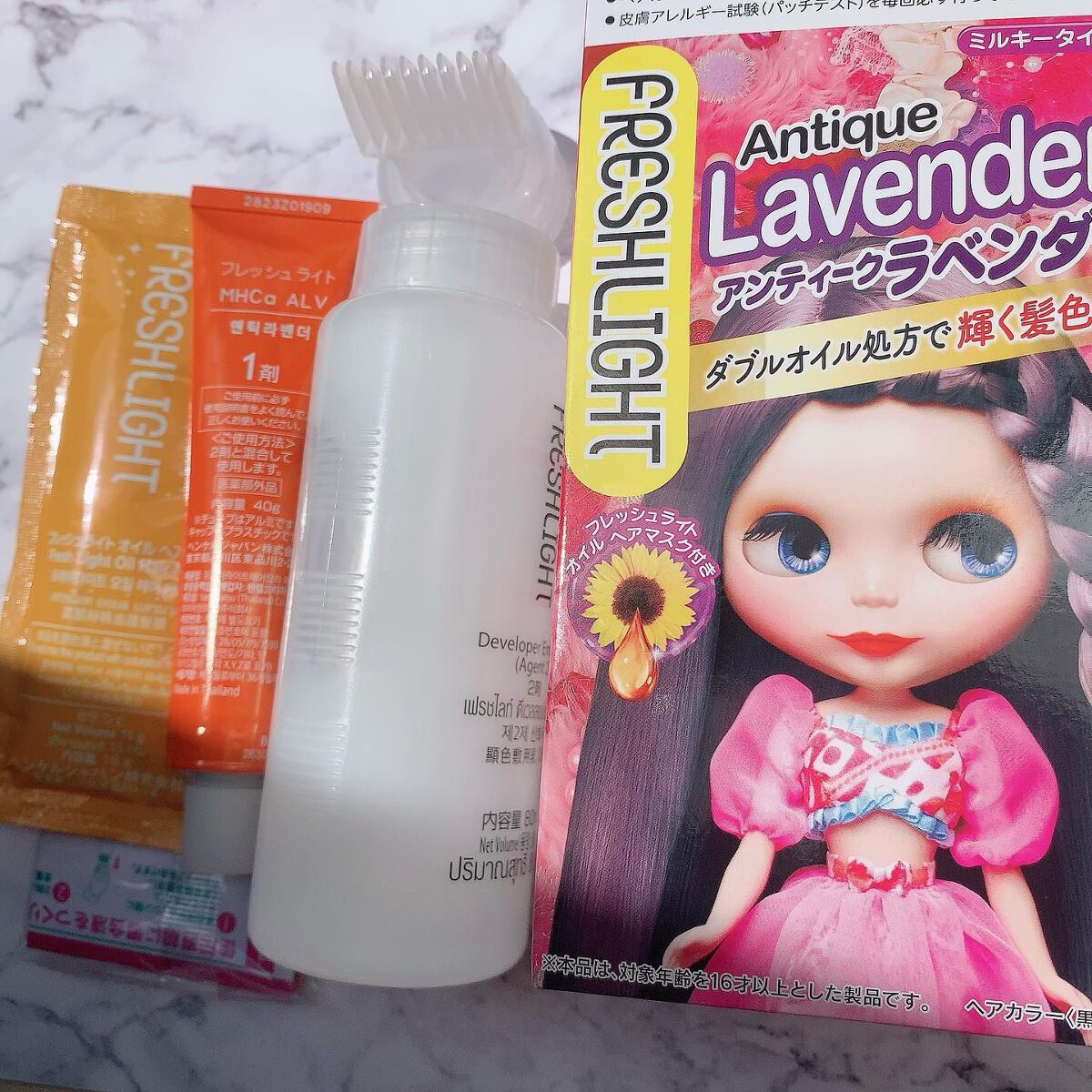 - <ロイヤルブラウン> フレッシュライト MHCa ROBR[有効成分]:塩酸2,4‐ジアミノフェノキシエタノール、パラアミノフェノール、メタアミノフェノール、硫酸トルエン‐2,5‐ジアミン、レゾルシン [その他の成分]:セトステアリルアルコール、流動パラフィン、ステアルトリモニウムクロリド、イソプロパノール、アミノエチルアミノプロピルメチルシロキサン・ジメチルシロキサン共重合体、塩化ジメチルジアリルアンモニウム・アクリル酸共重合体液、グレープシードオイル、ベタイン、DL‐PCA・Na液、ソルビトール液、セリン、グリシン、グルタミン酸、アラニン、リジン液、アルギニン、スレオニン、プロリン、濃グリセリン、エデト酸塩、無水亜硫酸Na、アスコルビン酸、POEステアリルエーテル、POEセトステアリルエーテル、強アンモニア水、香料 デベロパー M[有効成分]:過酸化水素水 [その他の成分]:セトステアリルアルコール、流動パラフィン、PG、ヤシ油脂肪酸アミドプロピルベタイン液、POEセトステアリルエーテル、親油型モノステアリン酸グリセリル、ヒドロキシエタンジホスホン酸液、ジエチレントリアミン5酢酸5Na液 フレッシュライト オイル ヘアマスク 成分:水、セテアリルアルコール、ミリスチン酸イソプロピル、ジメチコン、ベヘントリモニウムクロリド、ジステアロイルエチルヒドロキシエチルモニウムメトサルフェート、ステアラミドプロピルジメチルアミン、クエン酸、フェノキシエタノール、イソプロパノール、メチルパラベン、セトリモニウムクロリド、パンテノール、ビスアミノPEG/PPG‐41/3アミノエチルPG‐プロピルジメチコン、ポリクオタニウム‐10、ヒマワリ種子油、マカデミア種子油、アブラナ種子油、加水分解ケラチン(羊毛)、アーモンド油、アボカド油、アマニ油、アンズ核油、オオアザミ種子油、クロヨナ種子油、ゴマ油、サフラワー油、ブドウ種子油、香料 <チャコールグレージュ> フレッシュライト MHCa CHG[有効成分]:塩酸2,4‐ジアミノフェノキシエタノール、パラアミノフェノール、硫酸トルエン‐2,5‐ジアミン、レゾルシン その他の成分:セトステアリルアルコール、流動パラフィン、ステアルトリモニウムクロリド、イソプロパノール、アミノエチルアミノプロピルメチルシロキサン・ジメチルシロキサン共重合体、塩化ジメチルジアリルアンモニウム・アクリル酸共重合体液、グレープシードオイル、ベタイン、DL‐PCA・Na液、ソルビトール液、セリン、グリシン、グルタミン酸、アラニン、リジン液、アルギニン、スレオニン、プロリン、濃グリセリン、エデト酸塩、無水亜硫酸Na、アスコルビン酸、POEステアリルエーテル、POEセトステアリルエーテル、強アンモニア水、香料 デベロッパー Ma[有効成分]:過酸化水素水 その他の成分:セトステアリルアルコール、流動パラフィン、PG、ヤシ油脂肪酸アミドプロピルベタイン液、フェノキシエタノール、POEセトステアリルエーテル、親油型モノステアリン酸グリセリル、ピロリン酸Na、ヒドロキシエタンジホスホン酸液 リペア ヘアトリートメント 成分:水、セテアリルアルコール、ミリスチン酸イソプロピル、ジメチコン、アモジメチコン、ベヘントリモニウムクロリド、ジステアロイルエチルヒドロキシエチルモニウムメトサルフェート、ステアルジモニウムヒドロキシプロピル加水分解ケラチン(羊毛)、加水分解ケラチン(羊毛)、アマナズナ種子油、野菜油、ヒアルロン酸Na、ステアラミドプロピルジメチルアミン、パルミチン酸セチル、フェノキシエタノール、イソプロパノール、メチルパラベン、塩化Mg、ビスアミノPEG/PPG‐41/3アミノエチルPG‐プロピルジメチコン、乳酸、パンテノール、コハク酸、グアーヒドロキシプロピルトリモニウムクロリド、香料 <プレミアムベージュ> フレッシュライト MHCa PRBE[有効成分]:5‐アミノオルトクレゾール、パラアミノフェノール、硫酸トルエン‐2,5‐ジアミン、レゾルシン [その他の成分]:セトステアリルアルコール、流動パラフィン、ステアルトリモニウムクロリド、イソプロパノール、アミノエチルアミノプロピルメチルシロキサン・ジメチルシロキサン共重合体、塩化ジメチルジアリルアンモニウム・アクリル酸共重合体液、グレープシードオイル、ベタイン、DL‐PCA・Na液、ソルビトール液、セリン、グリシン、グルタミン酸、アラニン、リジン液、アルギニン、スレオニン、プロリン、濃グリセリン、エデト酸塩、無水亜硫酸Na、アスコルビン酸、POEステアリルエーテル、POEセトステアリルエーテル、強アンモニア水、香料 デベロッパー Ma[有効成分]:過酸化水素水 その他の成分:セトステアリルアルコール、流動パラフィン、PG、ヤシ油脂肪酸アミドプロピルベタイン液、フェノキシエタノール、POEセトステアリルエーテル、親油型モノステアリン酸グリセリル、ピロリン酸Na、ヒドロキシエタンジホスホン酸液 リペア ヘアトリートメント 成分:水、セテアリルアルコール、ミリスチン酸イソプ