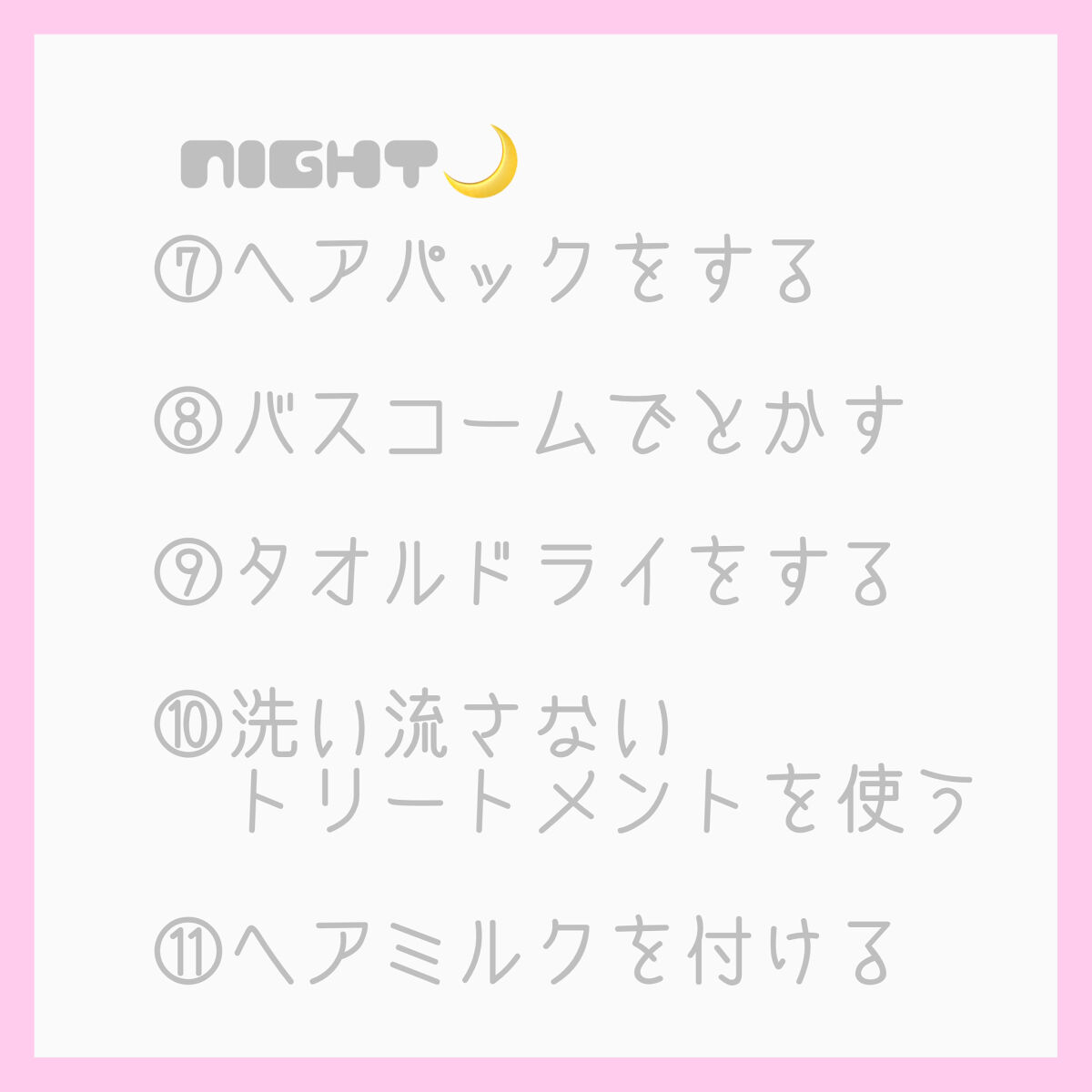 ③オイル&ヘアミルクをぬる‣‣アイロン前にします❕仕上げにオイルをして完成✨️ ⑦ヘアパックをする‣‣フィーノに出会って世界がかわりました✨️みんな1回騙されたと思って試してほしい😍 ⑩洗い流さないトリートメントを使う‣‣サラサラになるし、ドライヤーの熱を守ってくれます🫰🏻今使ってるものがもうなくなるので、皆さん何使ってるか教えてください♡