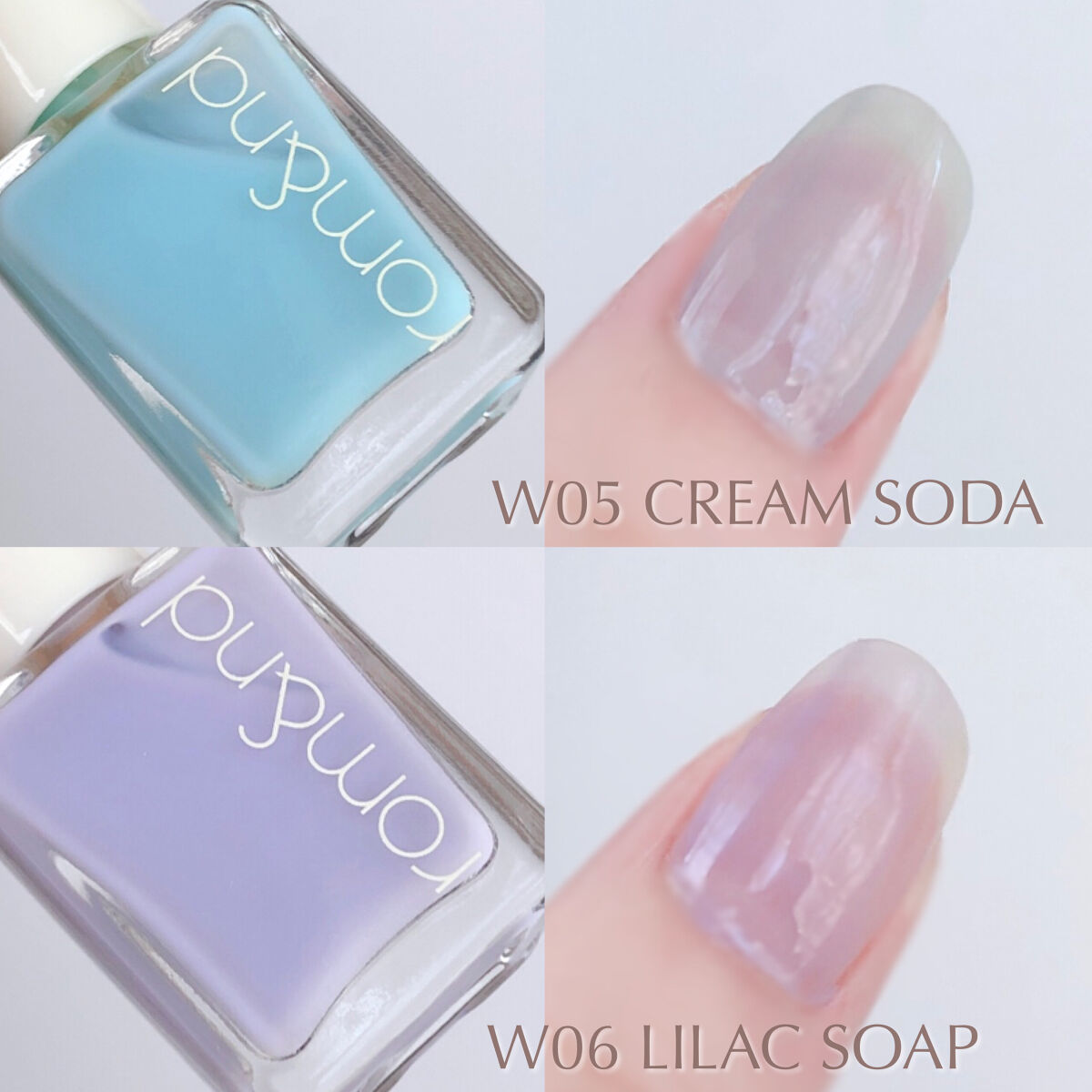 - 指先に玉石のような、ならかな光沢をとどめる。塗った瞬間から綺麗なツヤと光沢を維持し、重ねて塗っても透き通ったカラー感を鮮やかにとどめる、素早い乾燥力のナチュラルカラーネイル。「ロムアンド」の次世代型ネイルです。