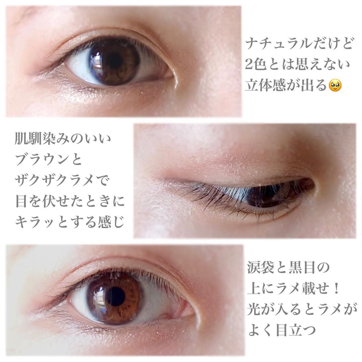 私が使用したのは「ソフト発色の絶妙なモーヴカラーで 血色感のある上品な雰囲気に」と公式の説明にある通り、 ふんわりくすみカラーがとってもかわいいんです🥹 ラメ入りのチーク大好きなのでこれは本当に刺さった...🥹 2はグレーがかった色にも関わらず顔色が悪くならず、 透け感のある色味だったので二重幅に沿ってほんのり 使うことで透明感があるメイクになった気がする! 3を涙袋と黒目の上に使用しましたが、濡れ艶って 感じのラメでハイライト効果も抜群🥹✨ 4は3よりさらにピンクみの強いメイクがしたい時に おすすめのカラーで、こちらもラメが可愛い! 5,6はどちらも目尻に使用していますが、5はラメ入りで 艶やかなので、より華やかさを重視したい時に 使っていこうかなと思っています!! 今までもエチュードのアイシャドウは大好きで いくつも使ってきましたが、今回はより発色もはっきりと していて質感も使いやすい気がするので(個人の感想😂) ぜひ皆さんもチェックしてみて✊🔥