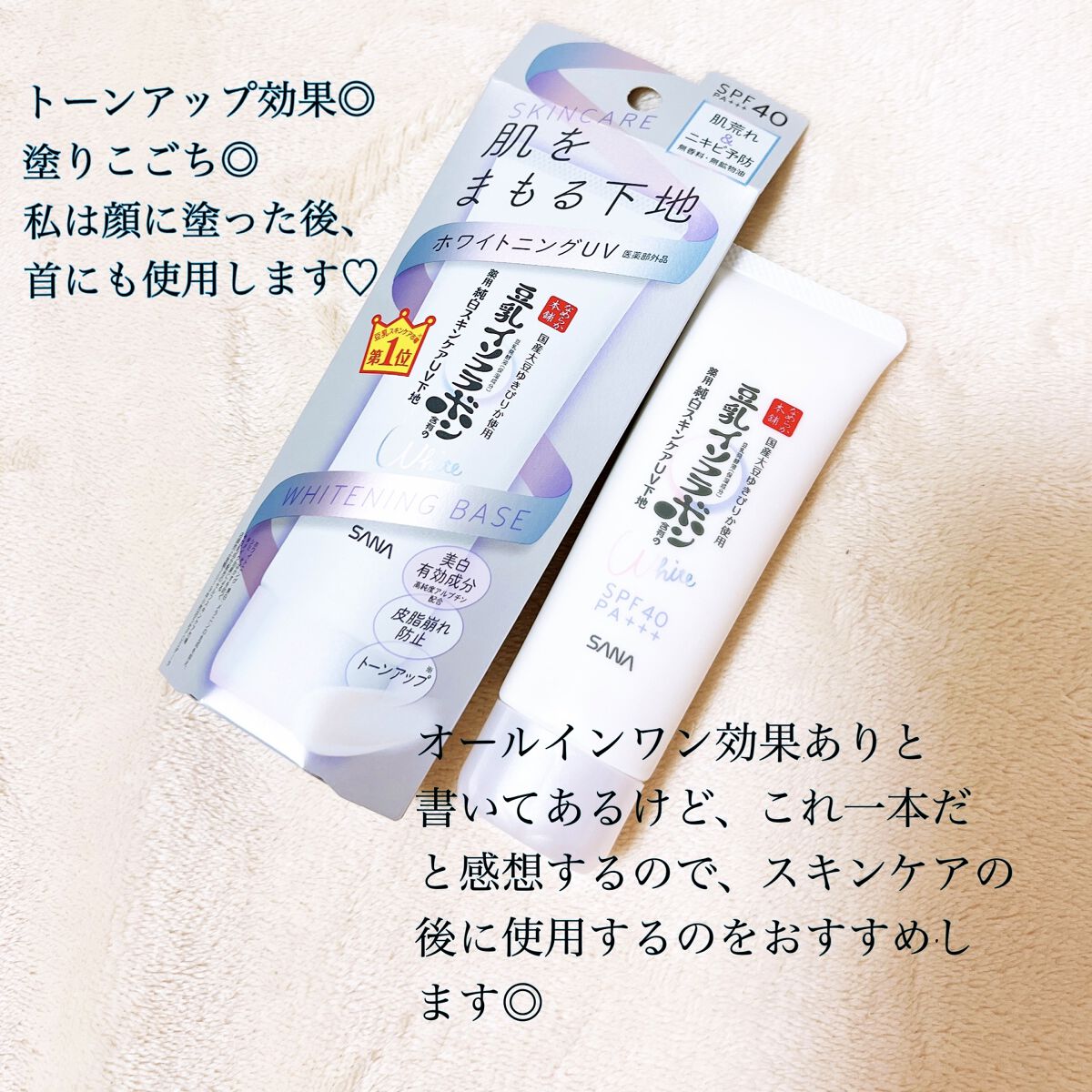 - <薬用美白スキンケアUV下地> 豆乳の美白スキンケアUV下地。肌荒れ&ニキビ予防しながら美白!メラニンの生成を抑え、シミ・そばかすを防ぎます。トーンアップ(メイク効果による)&皮脂崩れ防止。化粧水・美容液・乳液・クリーム・UVカット・化粧下地の1本6役。SPF40・PA+++。[販売名:サナ なめらか本舗 薬用美白スキンケアUV下地]