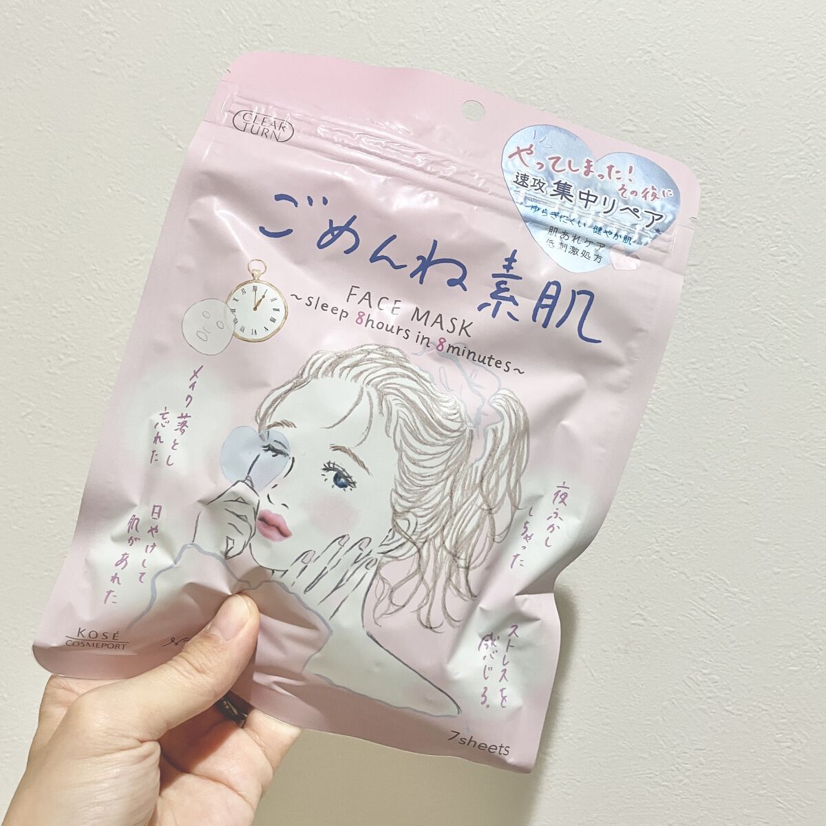 - 【クリアターン ごめんね素肌マスク】 負担をかけて、あれてしまった肌の素肌環境※1をととのえる“速攻集中リペア※2マスク”です。 ① あれがちな肌を素早くコンディションケア! ザクロエキス、桜エキス※3、ウメ果実エキスBG配合し、ゆらぎやすい肌環境をととのえ、肌あれをケアします。また、うるおいケア成分として、ヒアルロン酸、白キクラゲ多糖体BGを配合。外的ストレス※4や不規則な生活の影響を受けやすい肌も健やかでゆらぎにくい肌へみちびきます。 ②敏感肌も使える、弱酸性・低刺激処方 無香料・無着色・無鉱物油・アルコールフリー(エチルアルコール)・パラベンフリー・紫外線吸収剤フリー・シリコーンフリー・パッチテスト済み・アレルギーテスト済み・スティンギングテスト済み・敏感肌自覚者による連用テスト済み(すべての方にアレルギーや皮膚刺激が起きない、刺激感がないというわけではありません。すべての方の肌に合うということではありません。) ③角質ケアもできる!凸凹高密着シート コットン生まれのやわらかな肌触りのベンリーゼを使用。 表面に凸凹のエンボス加工を施しているため、密着性が高く、はがしたマスクでやさしく顔をふきとることで角質ケアもできます。 ※1 うるおい環境のこと ※2 うるおいお手入れのこと ※3 ソメイヨシノ葉エキス、ウメ果実エキスBGはウメ果実エキス・BG(保湿) ※4 乾燥による刺激のこと