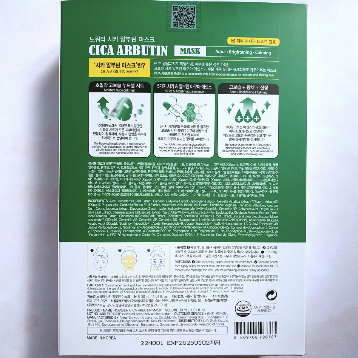 - 精製水無処方で、肌が求めるエッセンシャル成分だけでたっぷり満たしたピュアな化粧品ブランドNOWATERのマスクパックです。 5つのシカ成分*配合で、肌を整えるサポートをします。 アルブチン*を含んだアクアエッセンスが生き生きとして明るい印象の肌へ導き、パック1枚で保湿+ツヤ+整肌が可能なマスクパックです。 *保湿成分