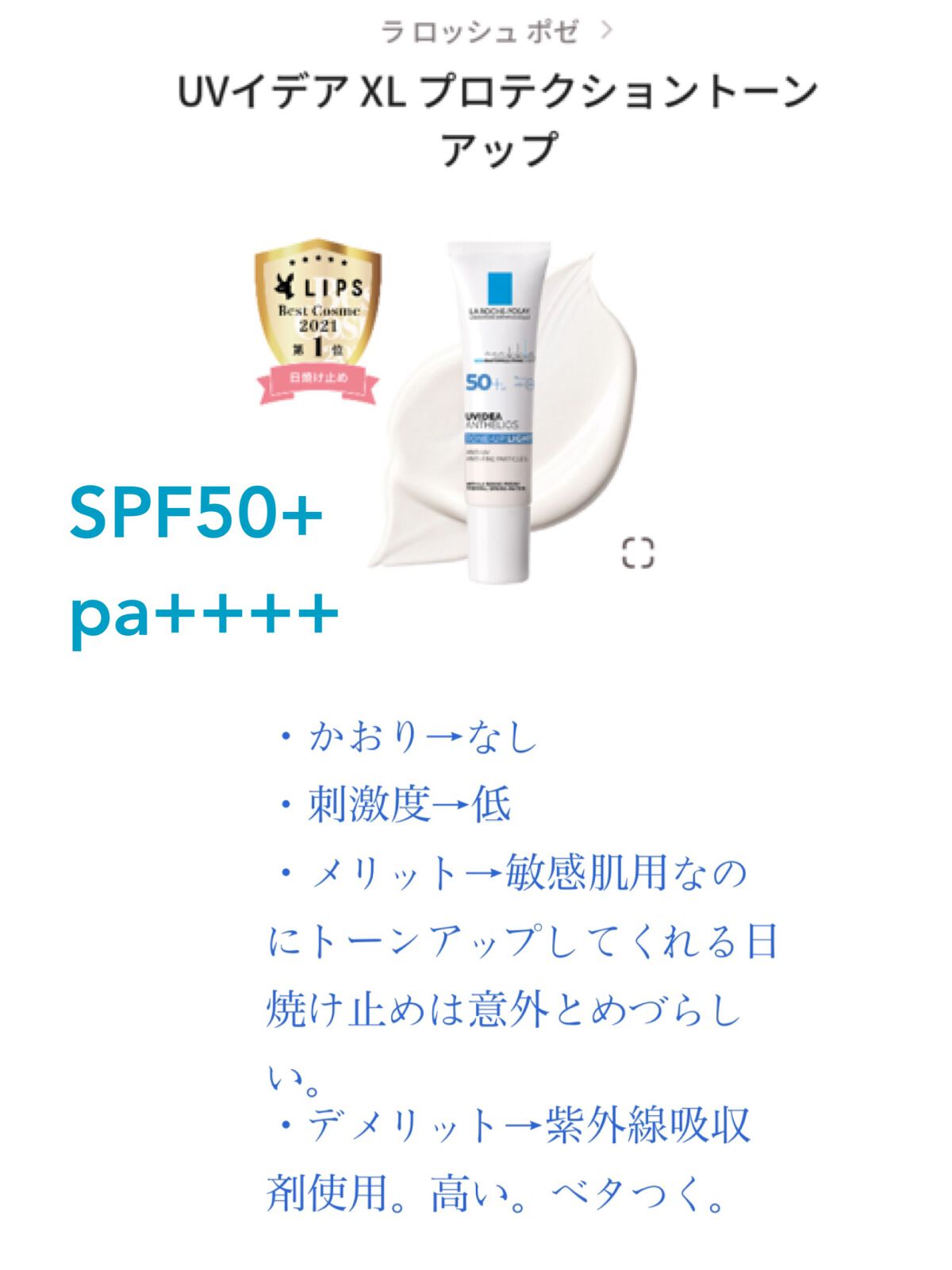 ついに来ました、日焼け止め界の女王、アネッサ様。もう炎天下のスポーツではこれを塗らないと気が済まない。 ただ!敏感肌の方に限らずこれを長時間つけると必ず荒れます。 あんまり知られてないこの日焼け止め。でも個人的にビオレUVアクアリッチウォータージェルの次に綺麗にトーンアップしてくれる気がする。 これは敏感肌の私たちにとってはまさに革命。紫外線吸収剤不使用で全くベタつかないのはこれ以外ないです。 クリアじゃない元々あるタイプのラロッシュポゼの日焼け止め。皮膚科でおすすめされるくらい肌に優しいのにトーンアップしてくれるので人気の理由がよく分かります。 ウォーターベースと書かれているけど....これは完全にクリーム。 これの特徴といえば...、そう、落ちない。いい意味でも悪い意味でも落ちない。