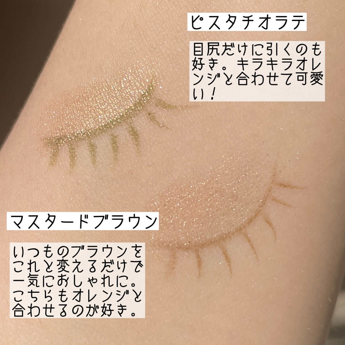 温かみがあり、肌なじみの良いモーヴピンクがナチュラルな陰影を作ってくれる秋らしい上品カラー! 繊細なラメの輝きが美しい……♡ 左上のベージュのきらめきが特に好き。 ベースとして使いやすいカラーです。 締色のブラウンも重たすぎず、締色不要なイエベ春の私でも使いやすい絶妙な感じ。 シーンを選ばず、大人可愛いをつくれる秋冬カラー。とっても可愛いです!!