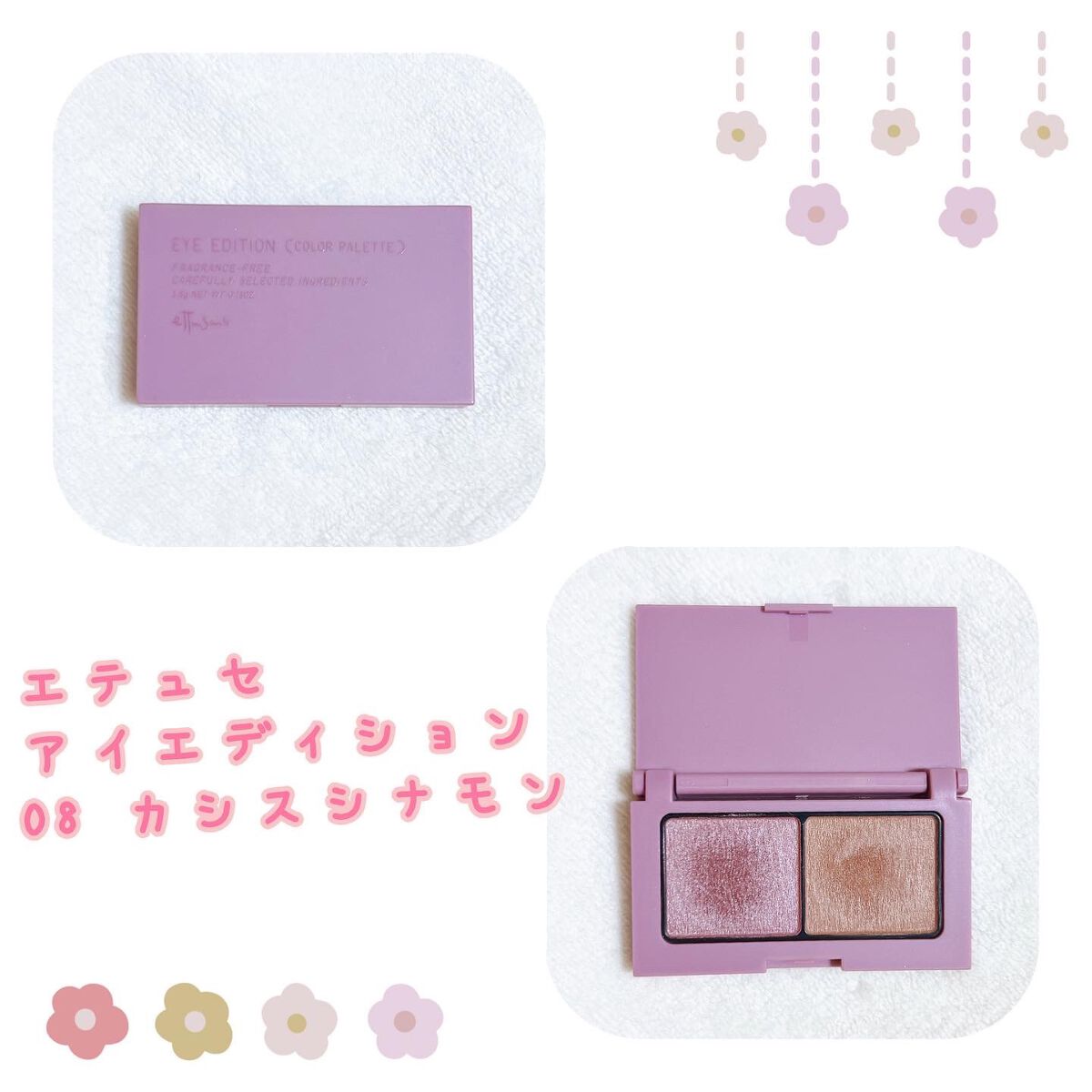 - 2つの質感で、 目もとに深みを演出する デュオアイシャドウ ●ツヤとマットの2つの質感で、肌になじみながらも目もとをナチュラルに大きく仕上げる。 ーなめらかなツヤを放つ「シルクカラー」と、ぬくもりのあるマットな「カシミヤカラー」の2種をセット。 ー肌なじみのよいゴールドパール配合 ●しっとりなめらかなパウダーがまぶたにフィットし、しっかり発色。 ●トリートメント成分配合 ースクワラン、ホホバ油 ●無香料 ●つけたての美しい仕上がりが長時間持続。(※22・23を除く) ●アレルギーテスト済み(すべての方にアレルギーが起きないというわけではありません)(※22・23を除く) <使い方> ●指またはお手持ちのチップをお使いください。 ●シルクカラーをアイホール全体に、カシミヤカラーをまつ毛の生えぎわからぼかすようになじませます。 <使用上の注意> ●目に入らないようにご注意ください。もし、入った場合は、こすらずにすぐに水かぬるま湯で洗い流してください。 ●落下などの衝撃により、割れることがありますのでご注意ください。 ●日のあたるところや高温・多湿のところにおかないでください。 ※07~21 販売名 : エテュセ アイエディション (カラーパレット) N 22~23 販売名 : エテュセ アイエディション (カラーパレット) a